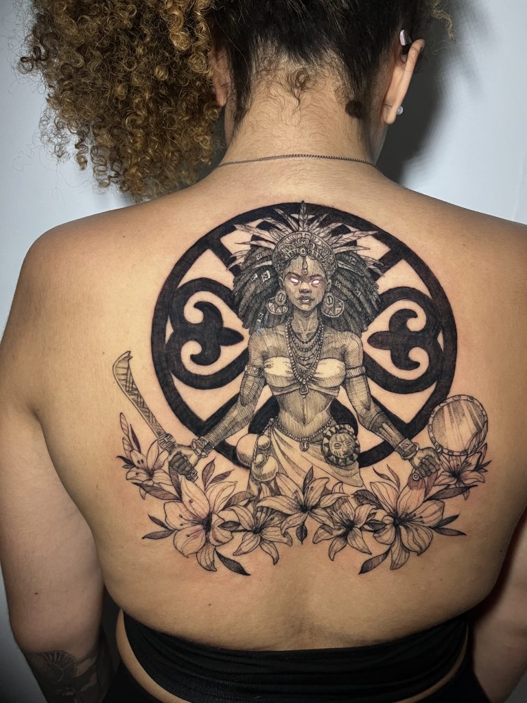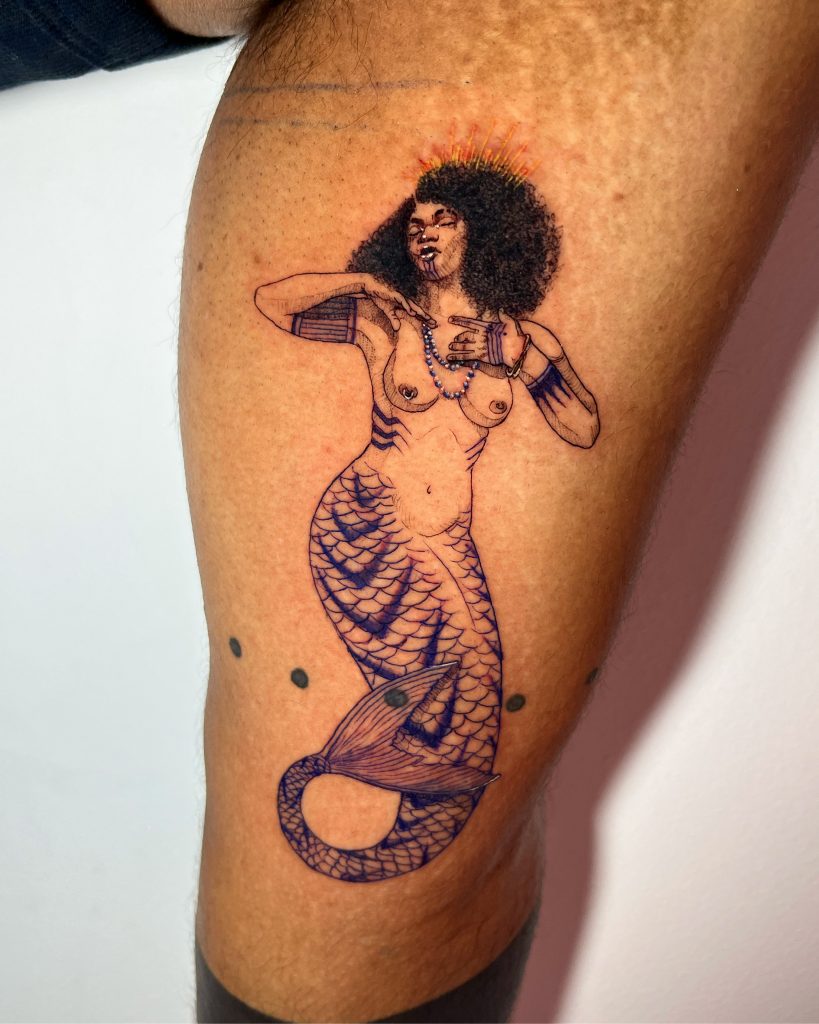 “Sou artista visual e dedico-me à tatuagem como uma forma de comunicação, perpetuando tradições ancestrais e transformando desejos e sonhos em projetos visuais repletos de detalhes e texturas,” compartilha Gabrielle. Com um estilo variado que abraça desde linework em preto e cores até composições autorais, Gabrielle se destaca por sua habilidade em entrelaçar temáticas como religiões afro-indígenas-brasileiras, negritude, mestiçagem, e sexualidades e gêneros dissidentes, com a beleza natural da fauna e flora.