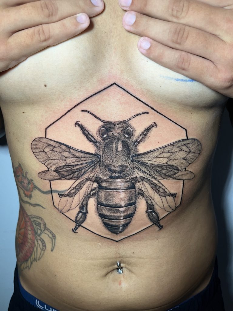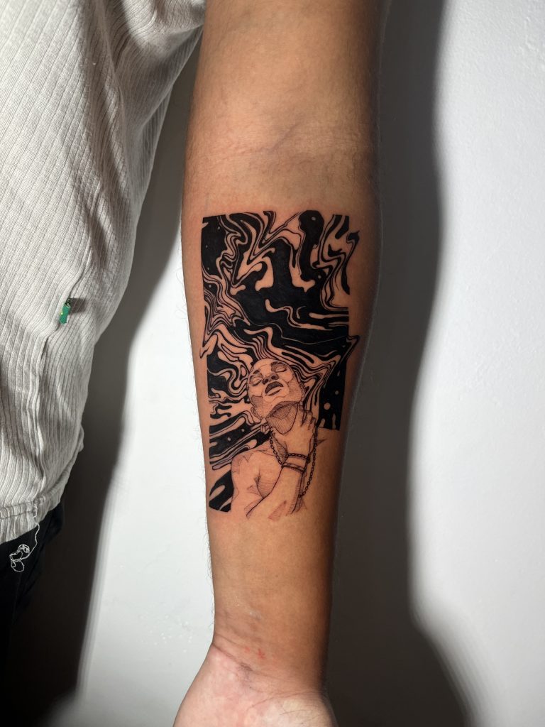 Gabrielle vê cada projeto de tatuagem como uma colaboração íntima: “Os projetos são criados em muitas etapas e conversas. Sou metódica em compor para entender e traduzir as ideias dos clientes, envolvendo-os ativamente no processo criativo.” Este método meticuloso não apenas assegura que as tatuagens sejam personalizadas, mas também que cada cliente se sinta parte da jornada artística, resultando em uma obra que é verdadeiramente única e pessoal.