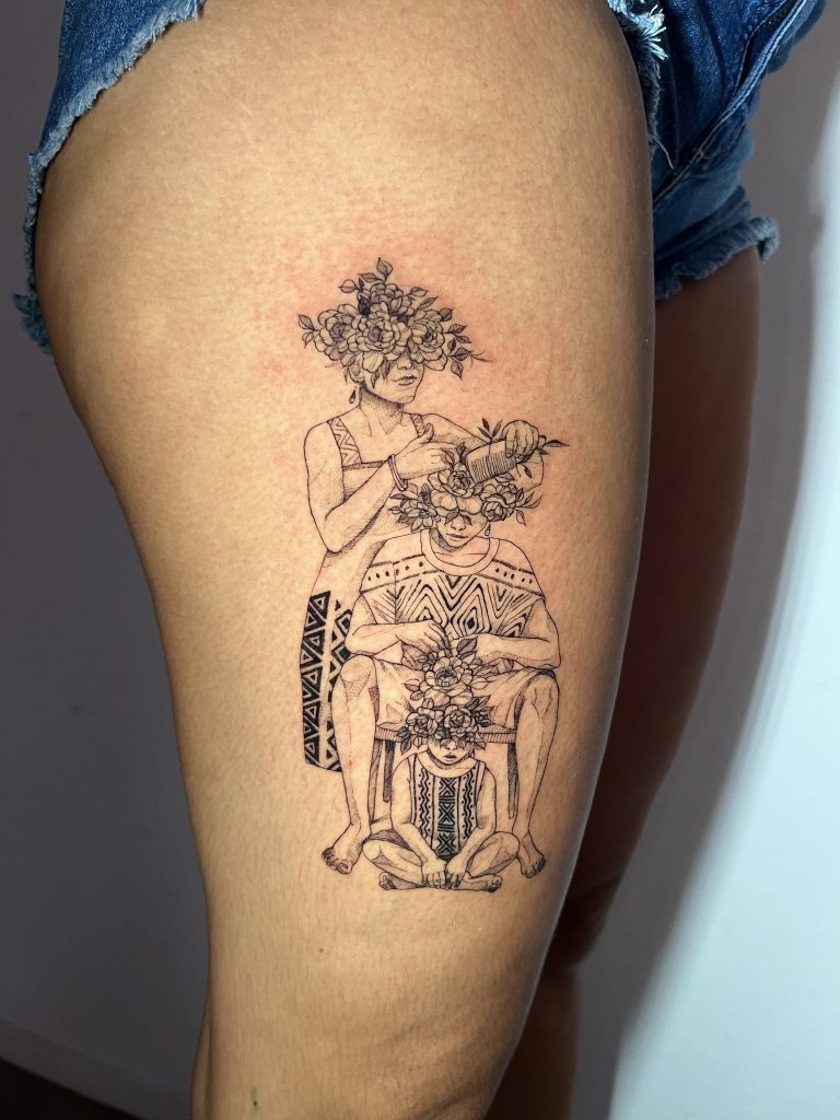 Gabrielle reconhece que cada tatuagem traz consigo seus próprios desafios e possibilidades. “Cada trabalho agrega conhecimento técnico e composição. Superar desafios é um processo de prática, estudo e, principalmente, troca com os clientes,” reflete Gabrielle. Essa abordagem não apenas aprimora sua técnica, mas também enriquece sua arte com as histórias e experiências compartilhadas.