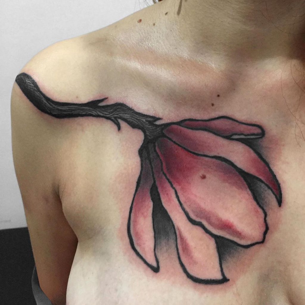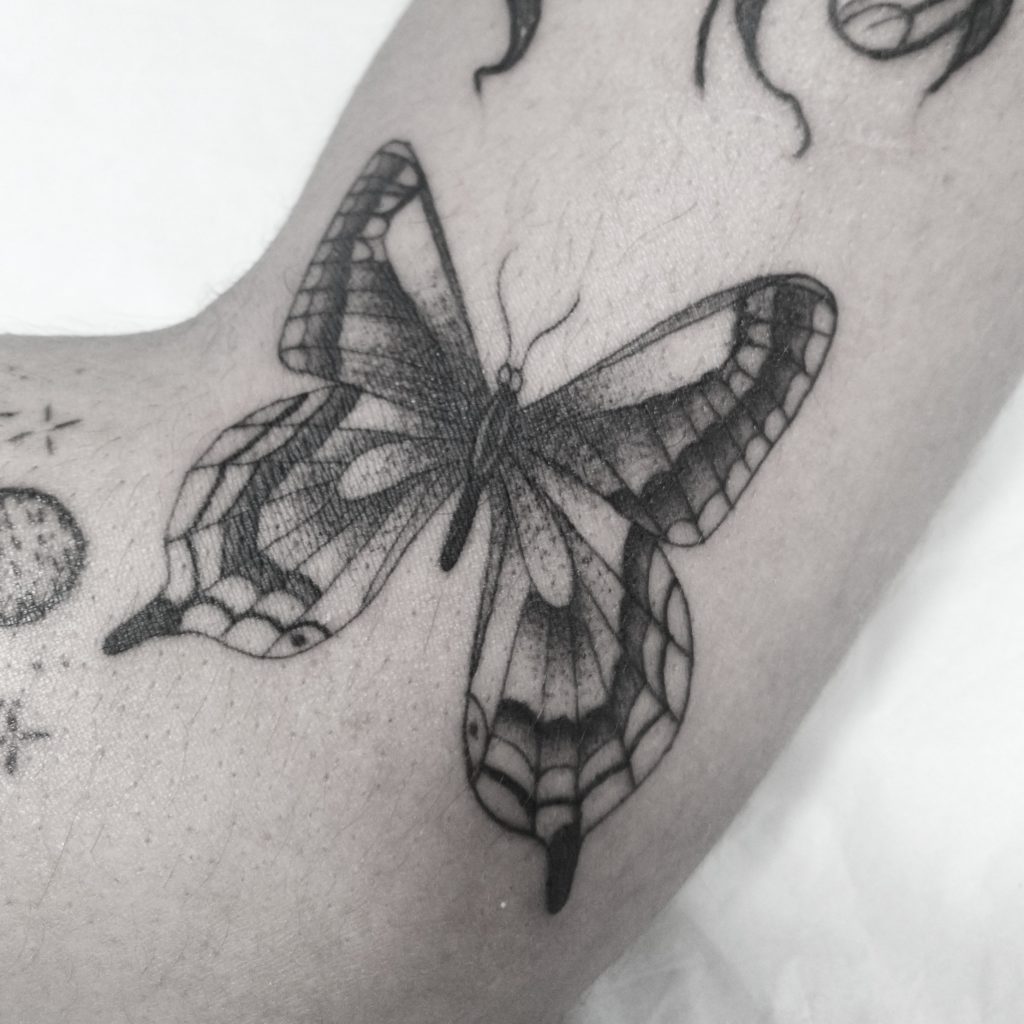 Moyara Araújo tem 27 anos e conta que sua proposta é realizar tatuagens exclusivas, autorais e atendimentos únicos! “Gosto de trocar muita ideia com cada um que chega até mim, incentivo a me contarem histórias que gostariam de representar, tem rolado muita música, livros, sonhos loucos, homenagens. Pesquiso muito e desenho e redesenho à beça até chegar num resultado do qual eu me orgulho de apresentar.”