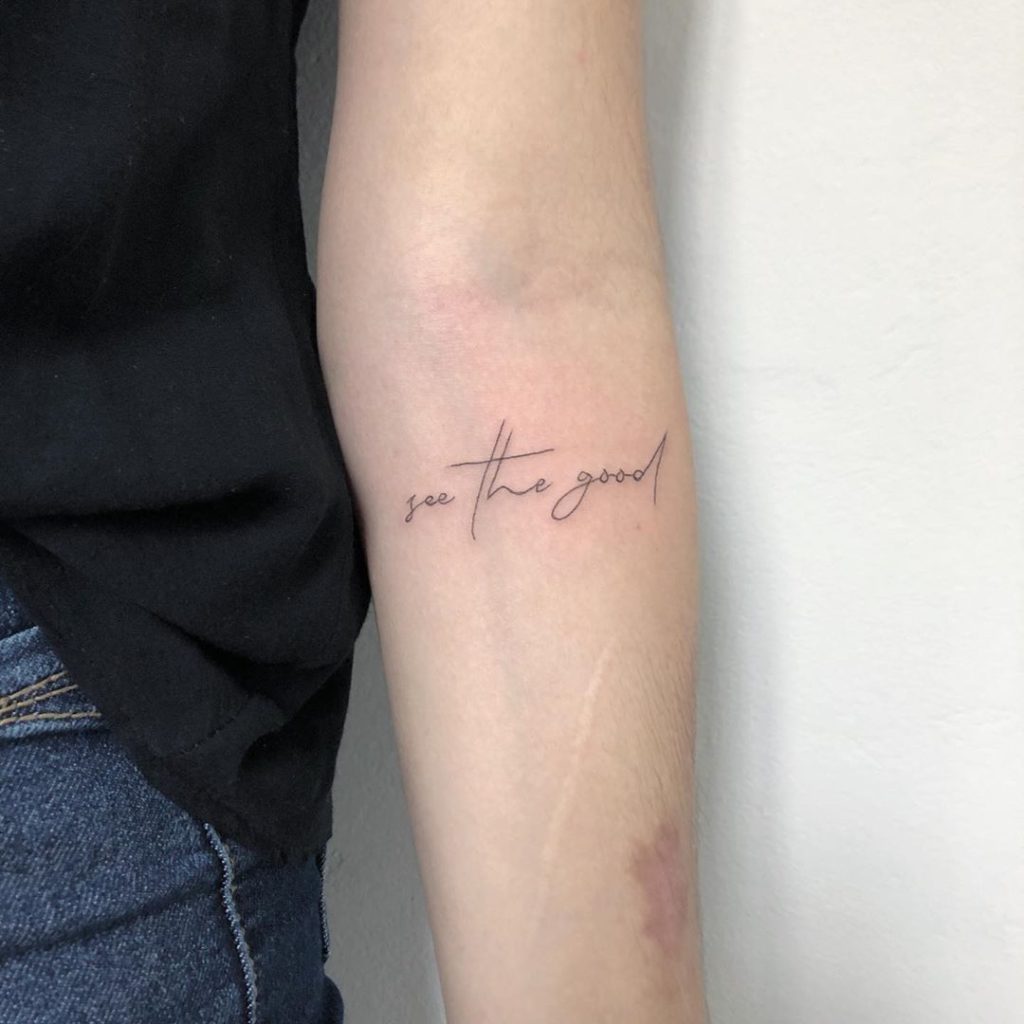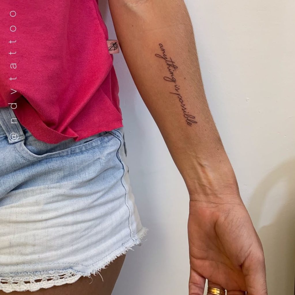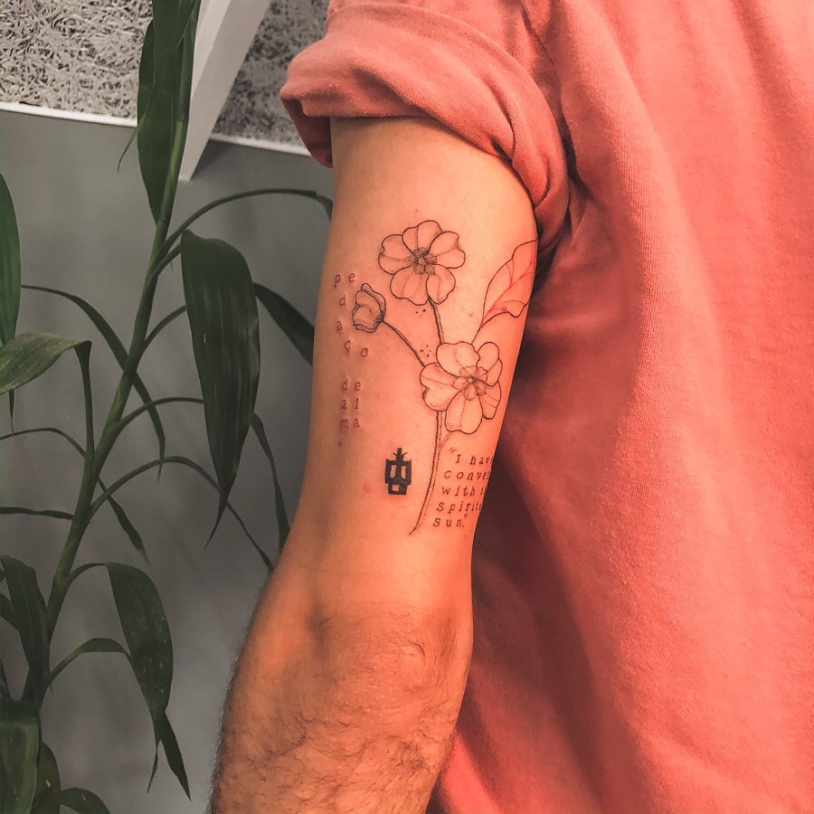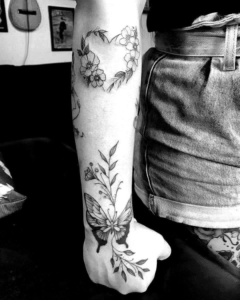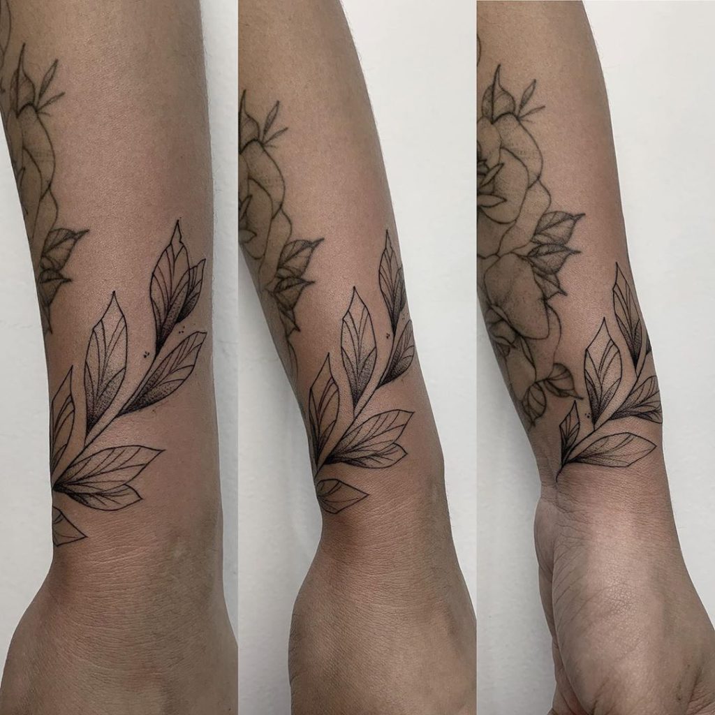 A artista é da cidade de Curitiba, no Paraná, e suas especialidades são o Fineline e o Blackwork. “Tenho como identidade de trabalho os traços finos e desenhos delicados. Amo tatuar escritas finas, desenhos minimalistas e projetos florais.”