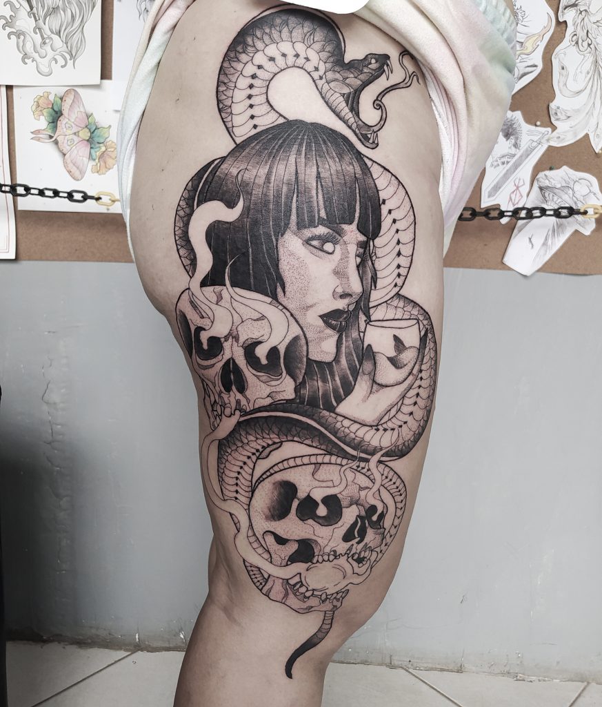 “Me chamo Lohane Takeda, paraense, natural de Ananindeua, iniciei na tatuagem no ano de 2016, destaquei-me no mercado pelos trabalhos na temática geek e sketchwork e colorido. Formada no curso de interprete/criador(ufpa) e desenhista de produtos gráficos (SENAI-PA). Prezo que todos meus trabalhos, tanto digitais, quanto feitos a mão sejam autorais, tendo como base/referência em animes, mangás e fotografias. A arte é atemporal, e desejo fascinar cada ser que se dispor a compartilhar da minha arte. Destacar Tatuadores na cena que me inspirem é dificílimo, pois Belém tem uma gama de artistas incríveis.Os artistas Paulo Raphael,Larissa Costa e Rildo Barros são minhas maiores referências no cenário da tatuagem paraense.”