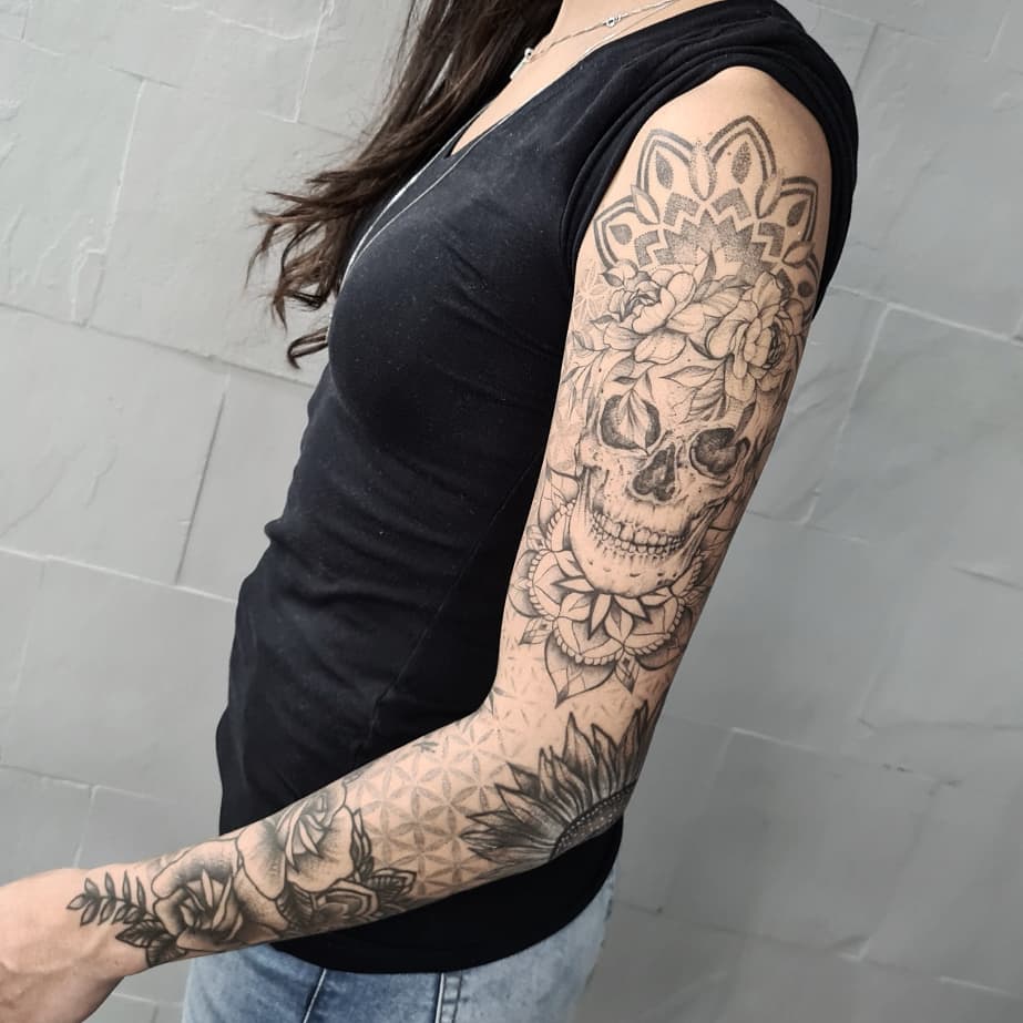 “Cheguei no mundo da tattoo há 6 anos, com inspirações em quadrinhos e na cultura dark, me identifiquei com o blackwork. Estou na busca por desenvolver um estilo de blackwork diferente do usual, mesclando algumas técnicas do realismo com texturas e contrastes do blackwork, em peças grandes e carregadas.”