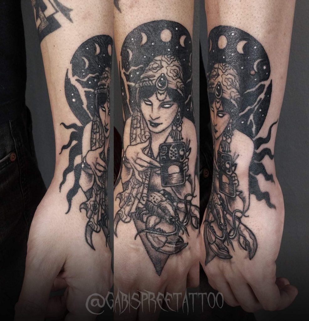 “Meu nome é Gabriela, tatuo desde 2007. Formada em Artes Visuais pela UFSM, trabalho com pinturas e ilustrações também! Minha inspiração vem da natureza, do ciclo lunar, espiritualidade, simbologias e figura humana! Meu trabalho é autoral, busco expressar em cada desenho a individualidade de cada cliente, resultando em uma tattoo exclusiva e cheia de personalidade seja colorida ou sombreada!”