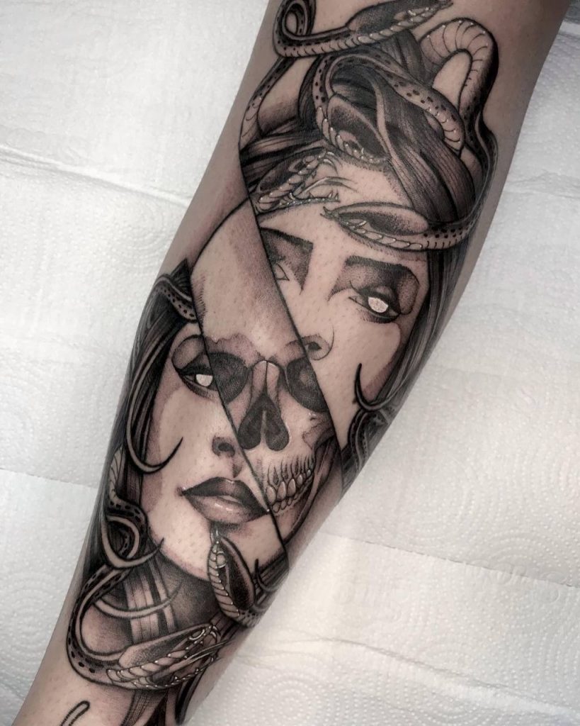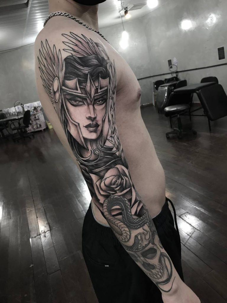 Gosto de trabalhar com blackwork, me identifiquei muito nesse estilo, misturando elementos de neotradicional e oriental e técnicas de sombreado old school e preto e cinza, minhas referências são @fredao_oliveira, @william_yoneyama, @carlosbenvenuto e @donrodriguestattoo.”