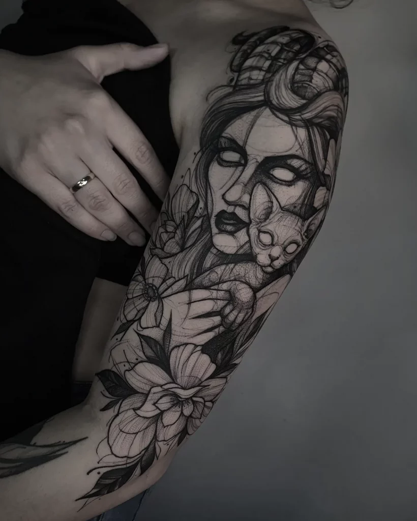 “Meu nome é Karime e eu tenho 26 anos e atuo profissionalmente há 6 anos. Antes de sair do ensino médio a tatuagem já estava na minha cabeça e aos 18 anos, ela aconteceu na minha vida. Tive uma passagem pelo fineline e hoje vivo do Blackwork e Realismo. A tinta preta é minha religião 🖤 No blackwork acontece minha liberdade, crio ilustrações autorais que as pessoas adotam ou propostas de projetos que me dão liberdade para fazer. No realismo eu me realizo “imprimindo” os pets. As sessões pet são apaixonantes, pois primeiro vem o cliente todo emocionado contando as melhores histórias e segundo, que eu fico horas olhando para umas carinhas lindas e peludas, sempre fui ligada aos bichos. Faço parte da equipe Verani tattoo de Porto Alegre-Rs e São José- Sc.”