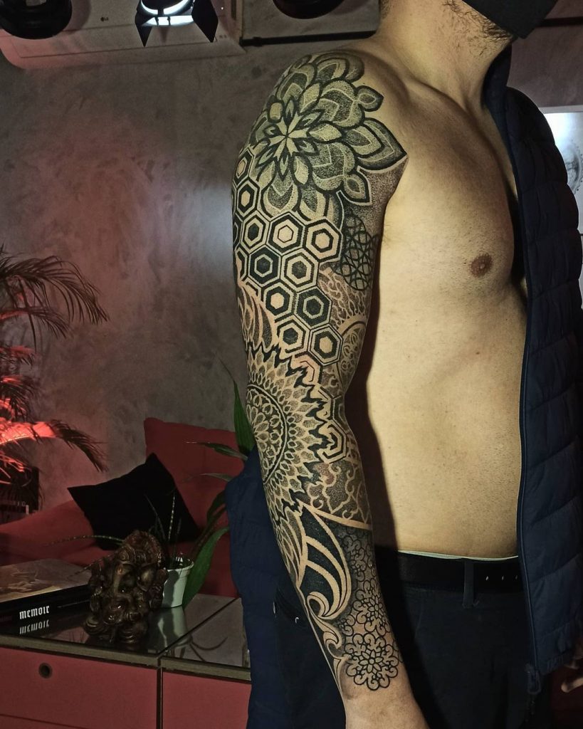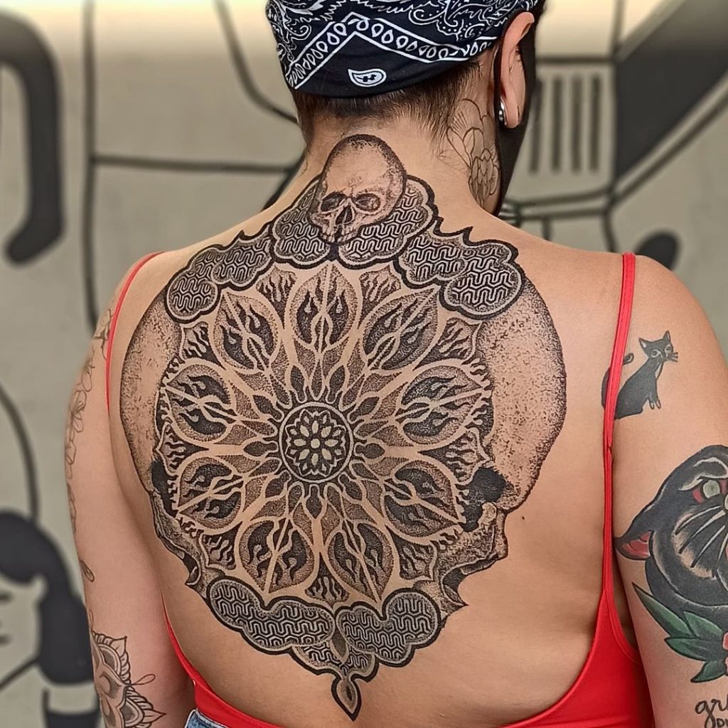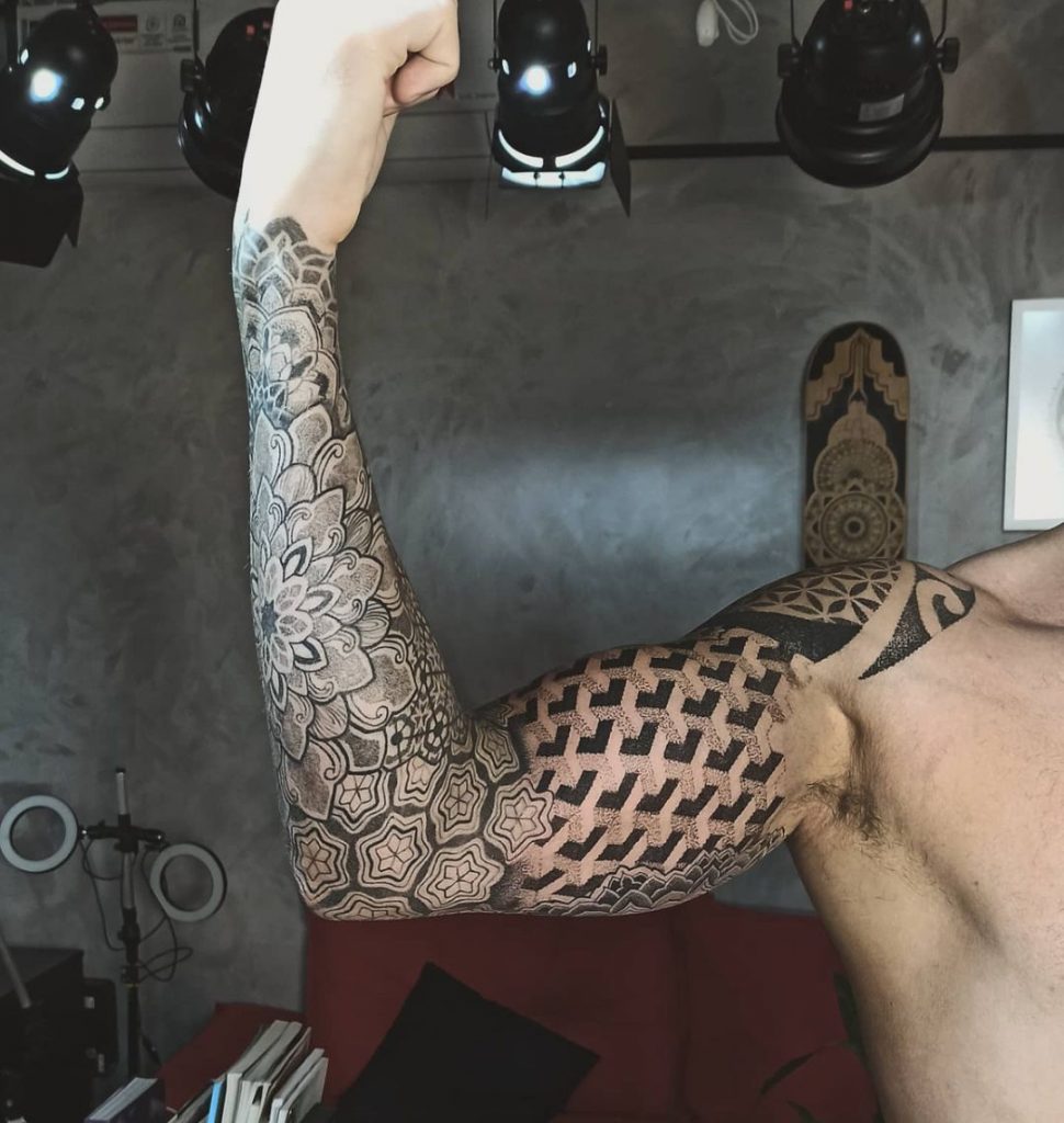 O artista conta que veio da área da Construção Civil e se apaixonou pela tatuagem. “Curto criar trabalhos em preto, geométricos ornamentais e tenho um carinho especial pelas mandalas. Uso como inspiração tudo que for relacionado com o estilo que estou desenvolvendo no momento.”