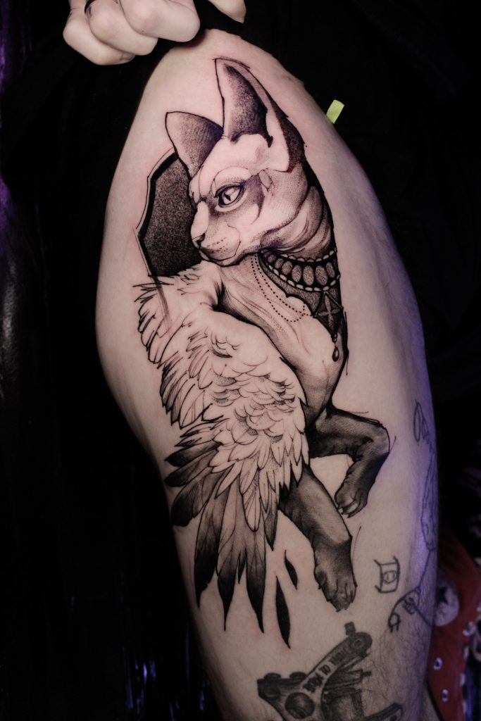 “Me chamo Kelvin Gabriel, dedico minha vida para a arte, mas para a tatuagem fazem somente 9 anos. Sempre aprendendo a cada novo traço ou pincelada. Atualmente na tatuagem trago uma proposta moderna, com traços soltos e definidos, sombras suaves e pintura solida, de preferência nas variações de preto, mas não recuso usar cores. Minhas maiores referências são os amigos que a tatuagem me deu.”