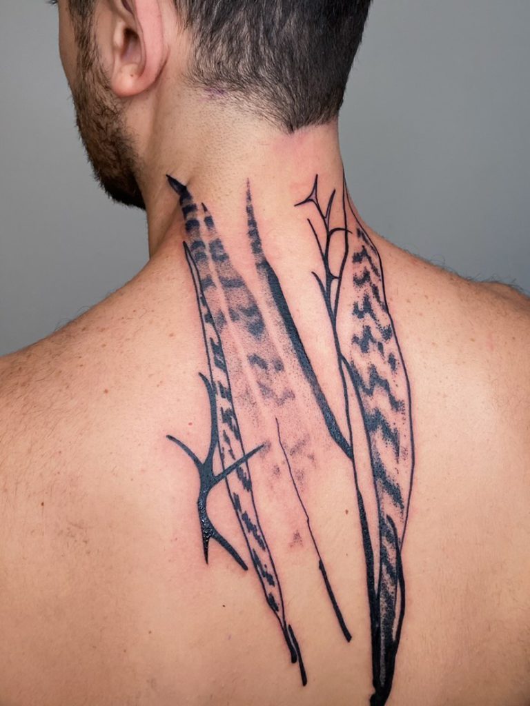 “Tatuando desde o final de 2018, foi durante minha graduação em biologia que decidi unir as paixões por natureza e arte em uma só forma de expressão. Usando como base linhas mais orgânicas, junto de elementos abstratos, eu busco trazer para o meu trabalho uma representação das formas e da fluidez encontradas em elementos naturais. Eu continuamente busco inspirações em diferentes formas de arte, como grafite, ilustração tradicional e até animação, mas na tatuagem minhas maiores inspirações sempre foram Yanina Viland, Paulina Kemnitz e Guga Scharf.”