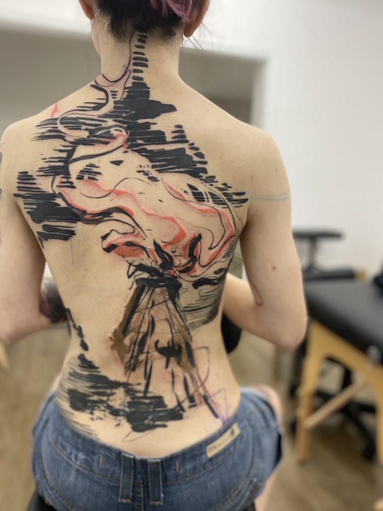 “Certo dia, estava olhando inspirações para fazer minha primeira tatuagem. Na época, não tinha nenhuma e fazia faculdade de Computação. Nesse dia foi como se alguém tivesse sussurrado em meus ouvidos: “Porque você nunca pensou em ser uma tatuadora?”. Desse momento em diante, corri atrás desse objetivo com toda a dedicação possível! Hoje eu tatuo há mais de 4 anos, faço faculdade de Artes Visuais na UFMG, e também sou pintora! O abstrato chegou na minha vida há um ano, através do estudo de alguns pintores que eu amo, como Pollock e kandinsky. Na adaptação para a Tatuagem, meu trabalho segue a linha do Expressionismo Abstrato, com foco maior na reprodução de uma pintura na pele.”