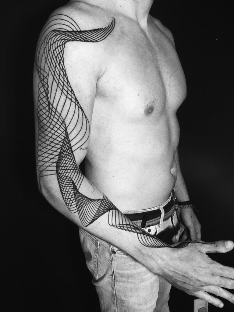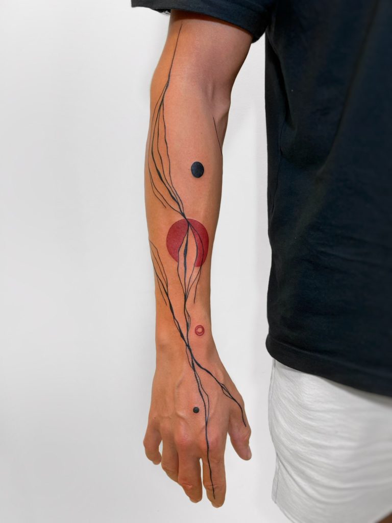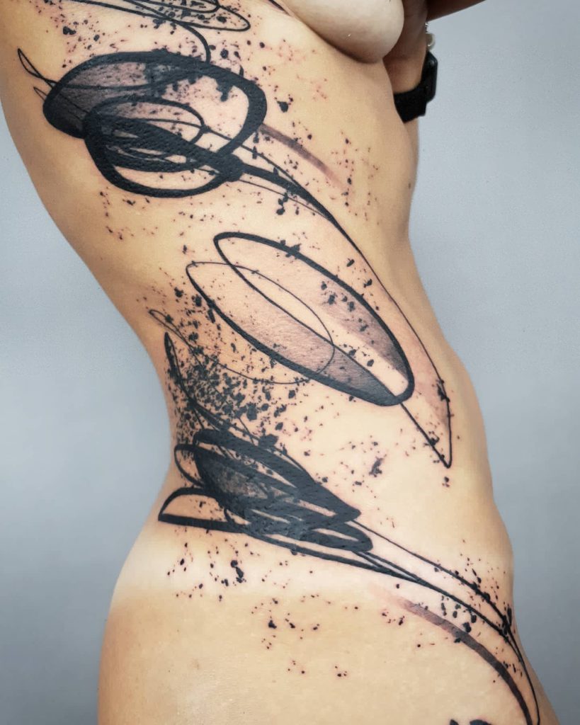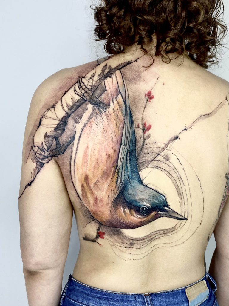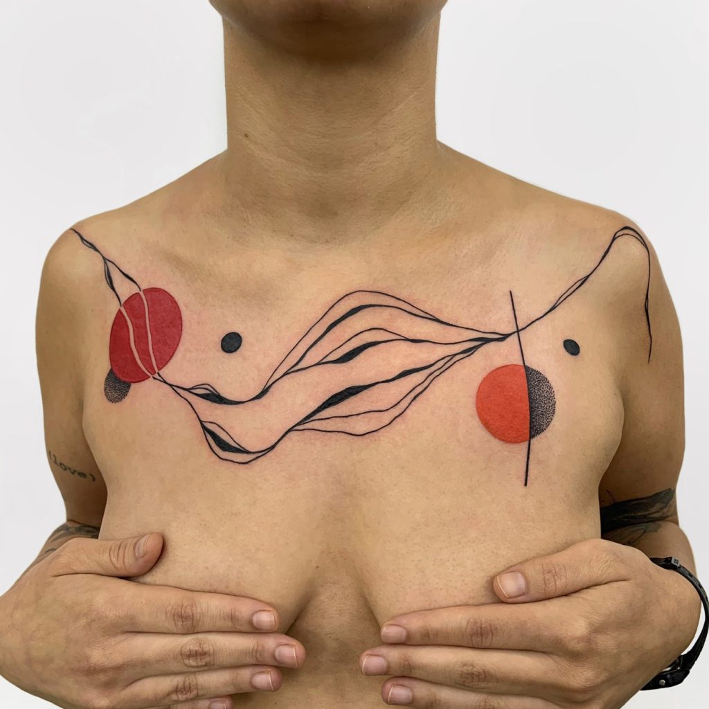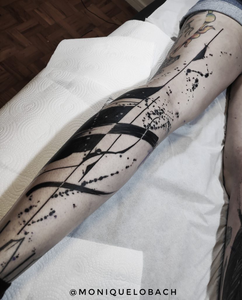 “Tatuo há quase 9 anos e quem começou me ensinando foi a Thais Valente, amiga querida. Hoje em dia faço um trabalho mais voltado para o abstrato. Gosto de pegar referências de grandes pintores e sinto que muito da minha inspiração vem deles, kandinsky, por exemplo, é uma forte influência, mas quando me perguntam o que me inspira eu sempre respondo: tudo, todas as formas que vejo.”