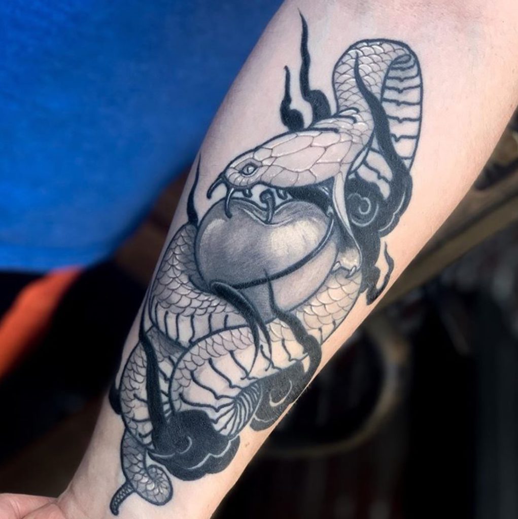“Eu jogava futebol, e consegui uma bolsa atleta para estudar na faculdade, e quando faltava um ano para eu me formar, conheci o meu mestre (japa), e comecei a trabalhar no estúdio dele, ele me acolheu e me ajudou em tudo. Sou grata demais por isso. E foi daí que terminei o curso e larguei tudo, para viver de tatuagem. Faz 3 anos que estou tatuando.“