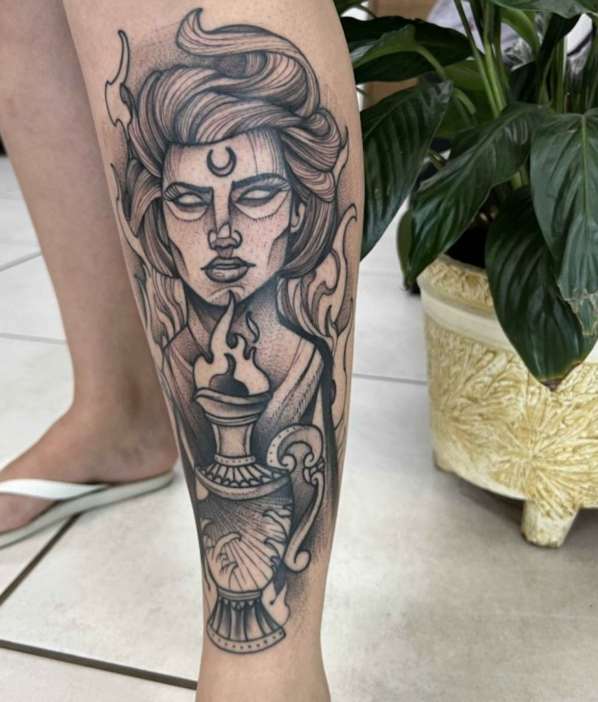 “Desde a infância, sempre gostei de desenhar. Aos 20 anos, comecei a trabalhar em um ateliê de artes plásticas, no Rio de Janeiro, e nesse meio tempo me formei em design. Em 2018, por estímulo de amigos, comecei como aprendiz em um estúdio de tatuagem. Somando experiências artísticas e inspirações de grandes mestres, fui desenvolvendo meu próprio estilo.“