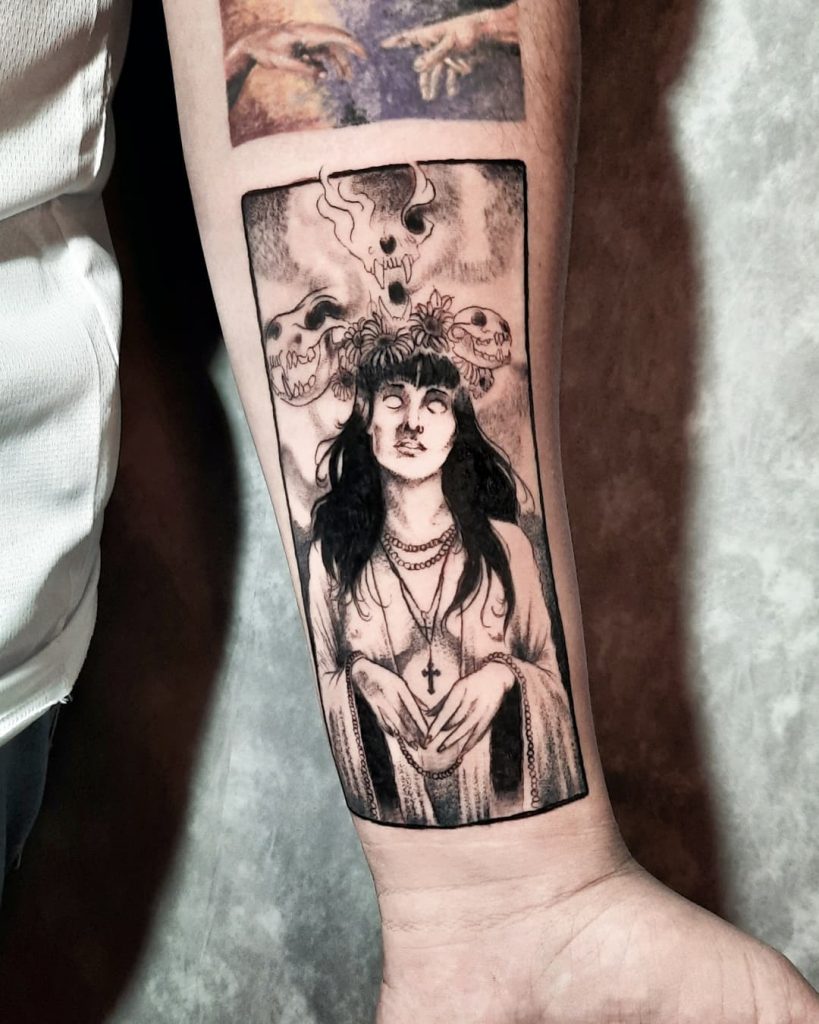 “Me chamo Pedro Tavares, tatuador em Belo Horizonte, MG, há 3 anos e meio. Meu estilo favorito é o blackwork, com toques de horror e art nouveau. Meu sonho é levar minha arte a todas as pessoas que conseguem ver beleza no caos. Minhas maiores inspirações são @carinaalok, @jennifertattoos e @iannbeneteli.”