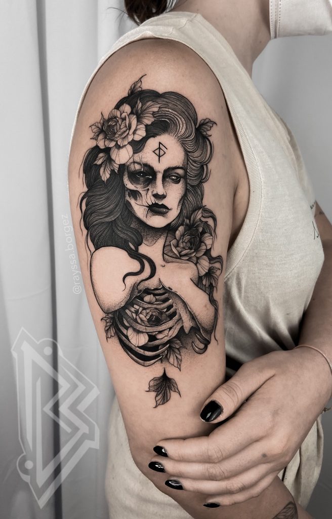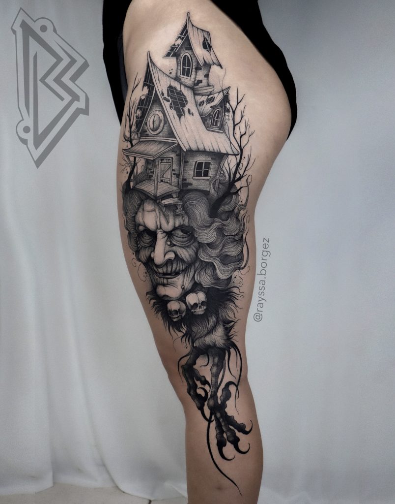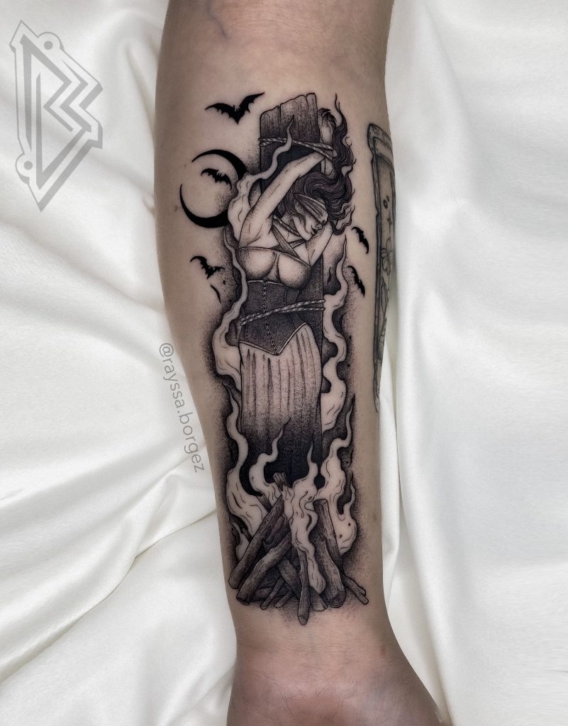 Rayssa Borges transforma sentimentos, histórias e memórias em tatuagens que carregam significado, detalhe e cuidado. Seu atendimento é acolhedor e marcante, sempre respeitando o corpo, os limites e os desejos de cada pessoa. Seu estilo, apelidado pelas clientes de “darlicado”, une o peso do preto sólido à leveza das linhas finas, criando composições sensíveis, contrastadas e intuitivas. Com base no blackwork, seu trabalho tem uma forte conexão com o universo místico, representando figuras femininas, deusas, bruxas, mitologia, astrologia e tarot. Cada arte é feita para valorizar não só o corpo, mas também a história de quem a carrega.