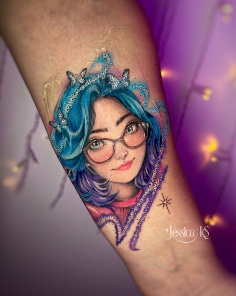 Jessica é puro brilho — literalmente. Tatuadora há 8 anos e formada em Artes Visuais, ela cria artes que parecem saídas de um universo mágico. Com traços finos, cores vibrantes e referências kawaii, suas tatuagens encantam como se fossem pequenas joias ilustradas na pele. Jessica é apaixonada por glitter e dá vida a coberturas criativas com efeito encantado, transformando memórias em arte. É como levar um pedaço do mundo da fantasia para o corpo. Conheça esse talento e se encante com sua arte única.