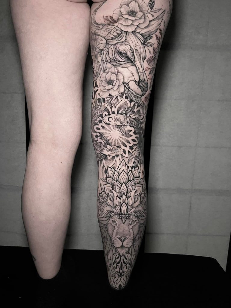 Giu Catalano transforma a tatuagem em um processo terapêutico e simbólico. Com formação em Psicologia, Arteterapia e Tarot, ela cria experiências profundas e acolhedoras onde corpo, mente e alma se alinham. Seu projeto “Sagrado Traço” traduz essa visão: cada tattoo é um talismã, um espelho da jornada individual. Seu estilo mistura traços finos, intuição e elementos místicos, muitas vezes com pitadas de dark art. Giu ama criar artes com elementos da natureza e simbolismos pessoais, resultando em composições que inspiram e conectam. Conheça esse talento e se encante com sua arte única.