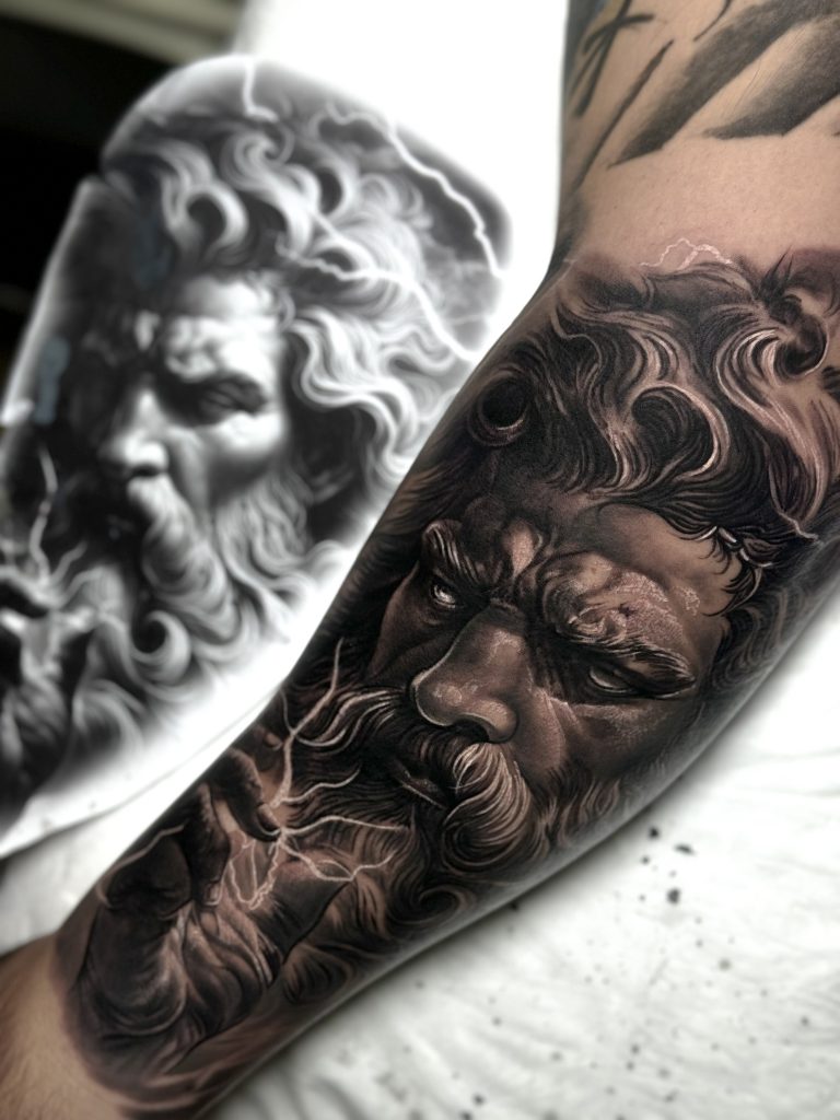 Andrew Iceman: tatuagem realista em Curitiba com alto contraste e acabamento impecável