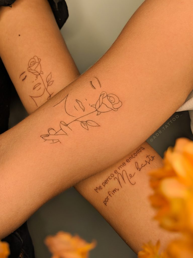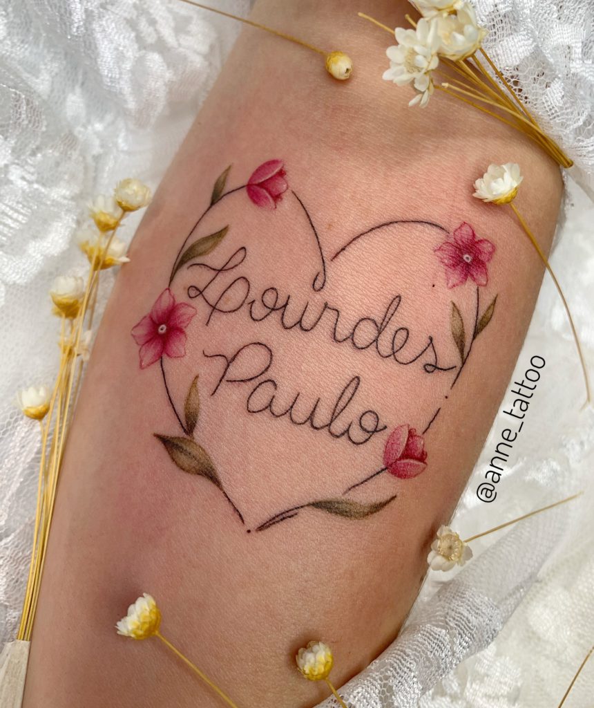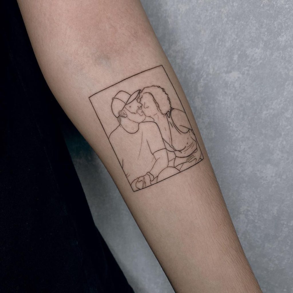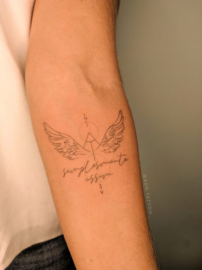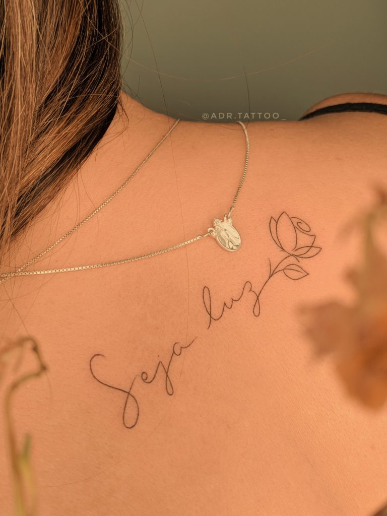 É possível na tatuagem fineline fazer homenagens a pessoas queridas como escrever o nome, retratos minimalistas de uma linha só e uma palavra que simboliza situações que vocês viveram.