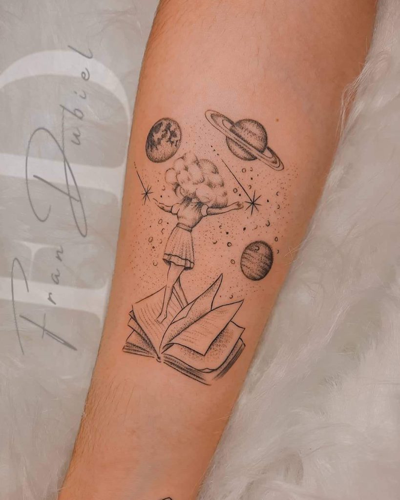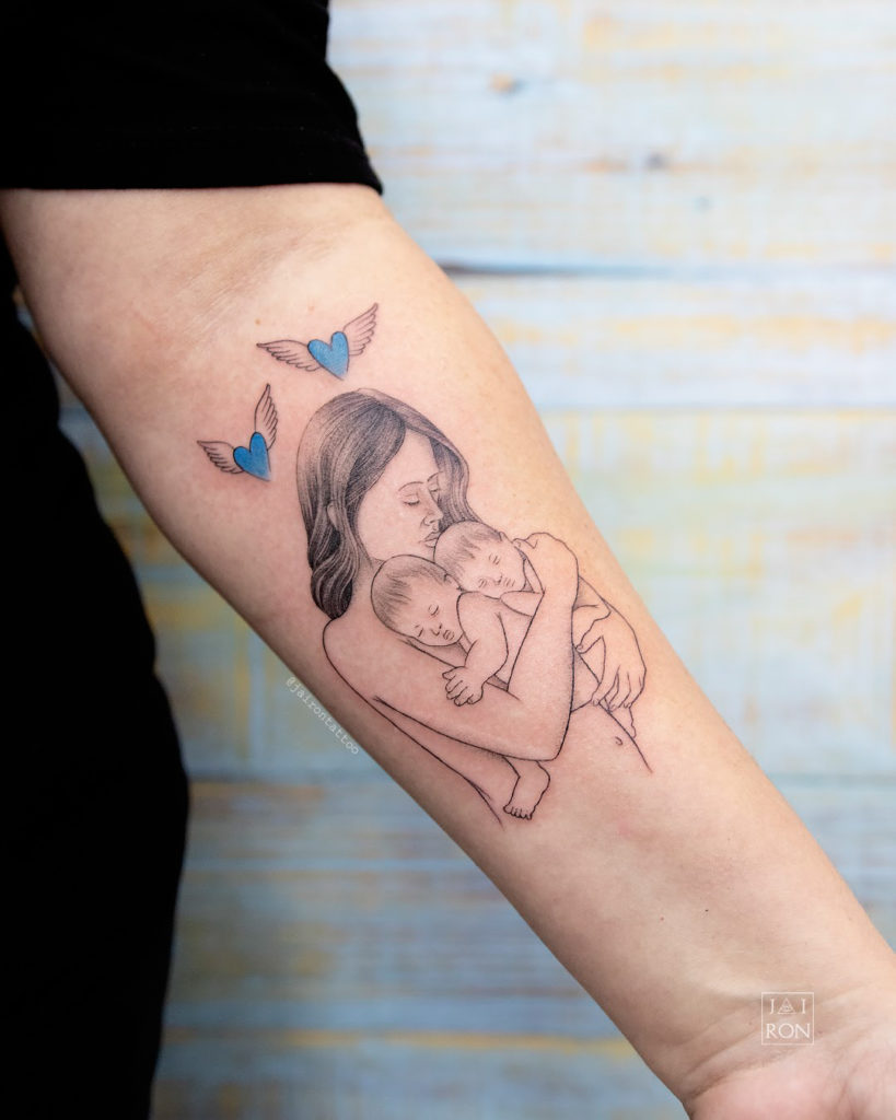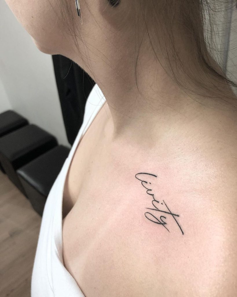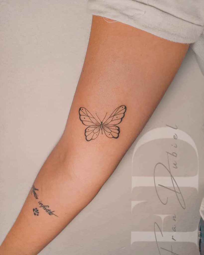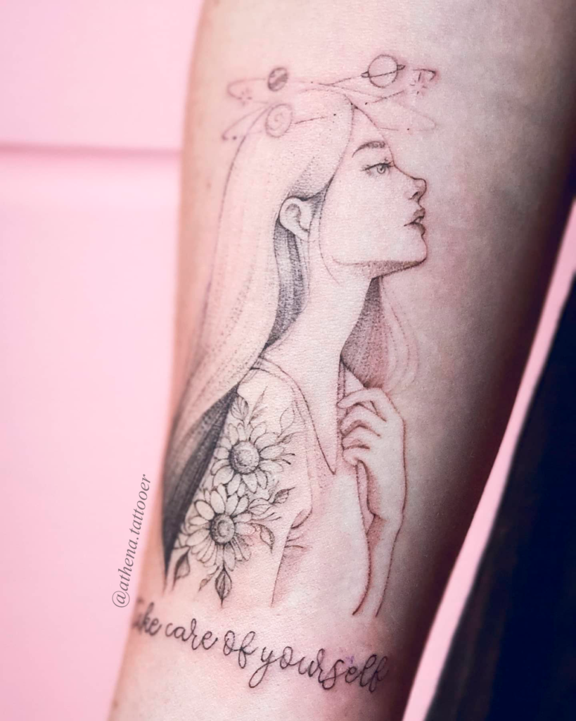 É possível na tatuagem fineline fazer homenagens a pessoas queridas como escrever o nome, retratos minimalistas de uma linha só e uma palavra que simboliza situações que vocês viveram.