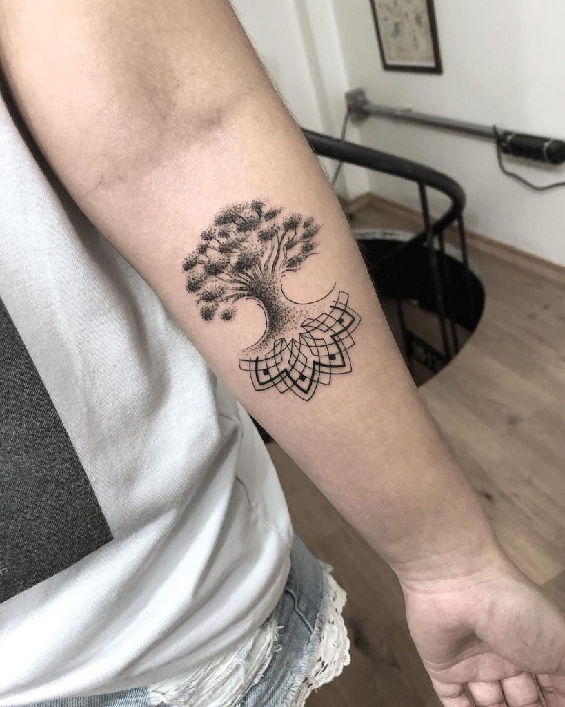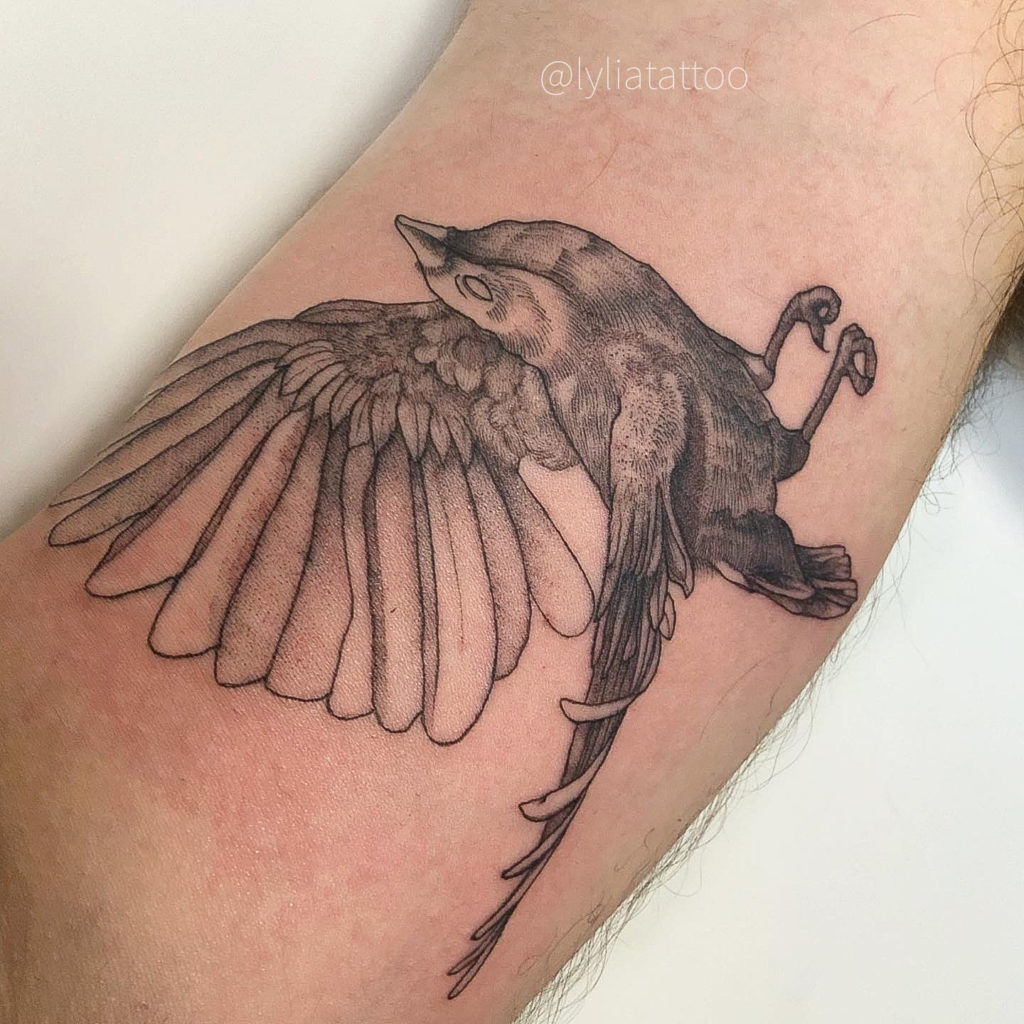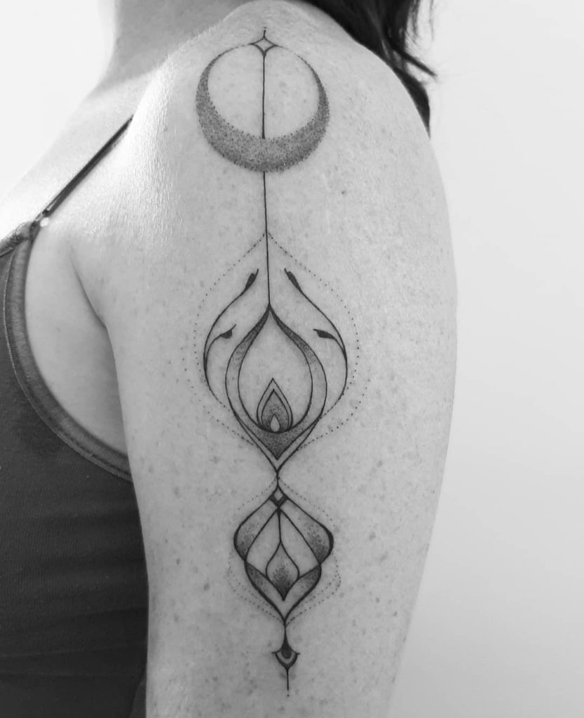 “Eu sempre gostei de desenhar e de história da arte. Desde criança era habilidosa no desenho e me envolvia em projetos artísticos na escola. Durante minha graduação em Gravura conheci a tatuagem e aprendi a tatuar alguns anos depois. Foi na tatuagem que encontrei a oportunidade de trabalhar com o que eu sempre gostei, desenho. Admiro diversas linguagens artísticas e algumas de minhas principais influências são Goya, Duhrer, Grete Stern, Schiele, as xilogravuras japonesas e também aprecio muito as ilustrações botânicas antigas. Busco em minhas composições explorar a suavidade das linhas finas e as diversas possibilidades de textura no desenho, seja através do pontilhismo, seja através de hachuras.”