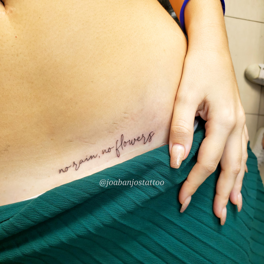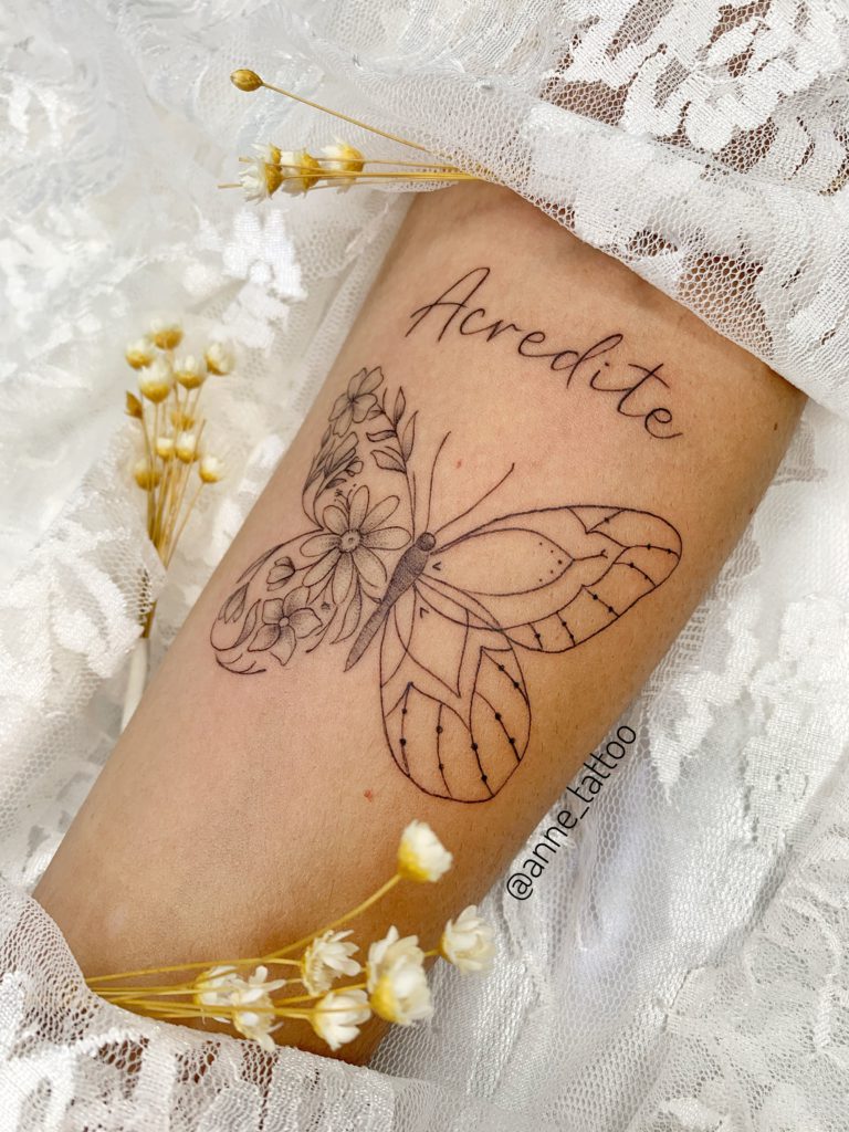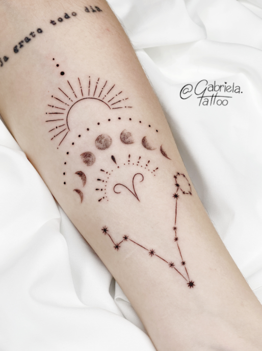 “Me tornei tatuadora aos 24 anos, comecei com o pé direito e tive todo o apoio e suporte que precisei graças ao meu esposo, Filipe também profissional da área e minha mãe que sempre me apoiou e incentivou na arte desde a infância. Me encontrei nas artes delicadas de traços finos por gostar muito de trabalhar com o público feminino e admirar a delicadeza e empatia dessas guerreiras que tenho a honra de conhecer ao longo da minha carreira. Na criação me inspiro muito na natureza, astrologia e amo uma caligrafia.”