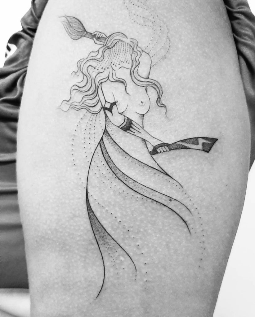 Day Ribeiro tem 30 anos e é tatuadora há 4 anos. A artista conta que gosta muito de desenho, desde criança: “Tatuar sempre foi um sonho, mas o deixei de lado para estudar e trabalhar com outras coisas, até que conheci amigos tatuadores que me impulsionaram a começar, desde então não parei. Eu pego inspiração na natureza e no feminino.”
