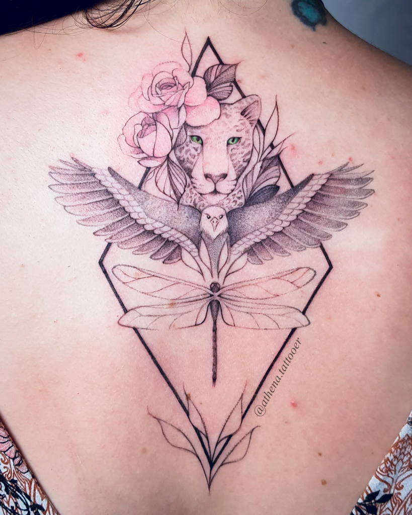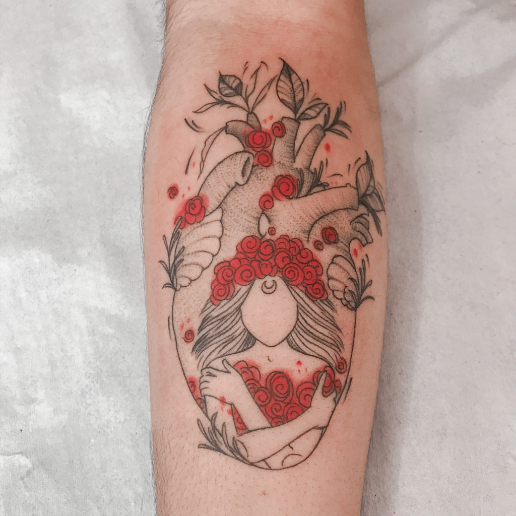 Como o Design, a moda, mas nunca me encaixei nessas áreas. Até que eu descobri a tatuagem e hoje eu vivo meu propósito. Tatuo há 1 ano e meio, sou obcecada por tatuar. Trabalhar com minha arte autoral e poder contar as histórias dos meus clientes é o que me completa. Minhas maiores inspirações são as artistas Karolina Szymanska e Gizele Goes. A arte faz parte de quem sou e da minha essência.”