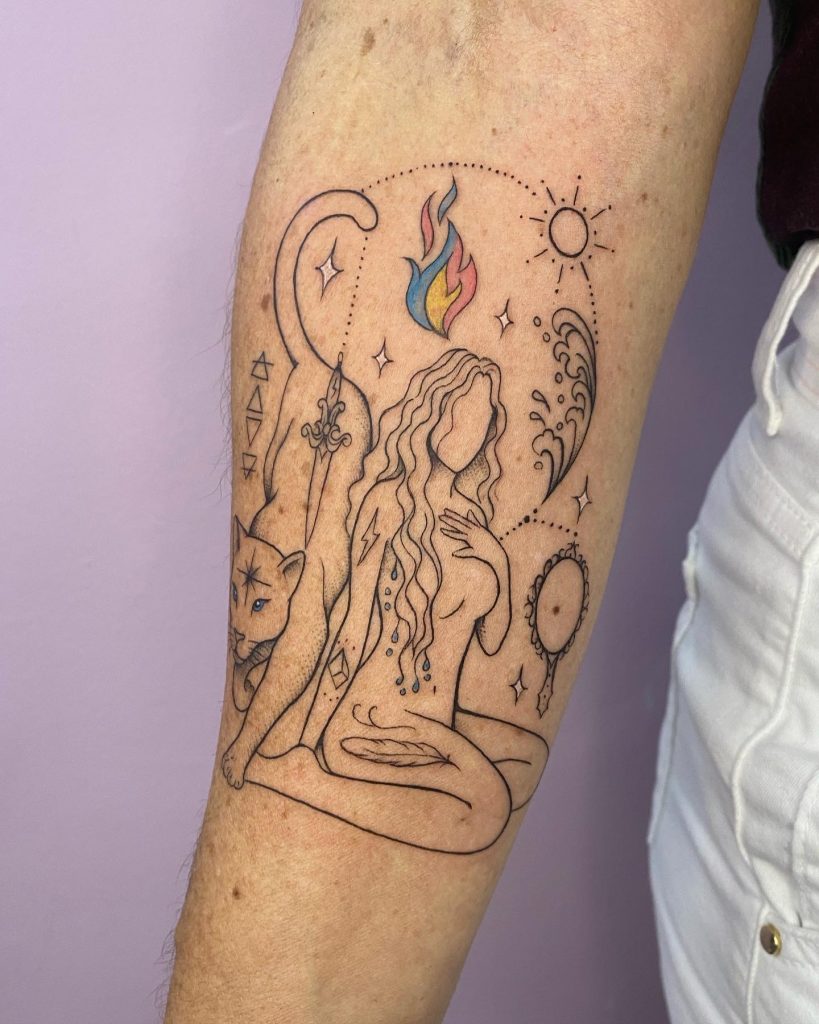 Luana Dórea cria tatuagens que misturam delicadeza e simbolismo, com uma estética sensível e mística. Seus traços finos exploram o universo do sagrado feminino, espiritualidade, natureza e elementos mágicos. Figuras como olhos, mãos simbólicas, corpos femininos e amuletos ganham vida em composições cheias de significado. Seu estilo é marcado por equilíbrio, leveza e uma forte conexão com o invisível — cada tattoo é quase como um feitiço desenhado à mão, feito para inspirar e proteger. Além das tatuagens, Luana também realiza encomendas de desenhos autorais para quem não está em Salvador, e disponibiliza um e-book de ilustrações com sua arte sensível e única.