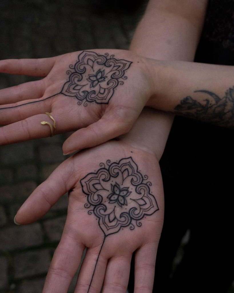 Projetos de tatuagem com traços mais sólidos são mais recomendados para a palma da mão, para que o desenho não se desconfigure tanto com o passar do tempo.