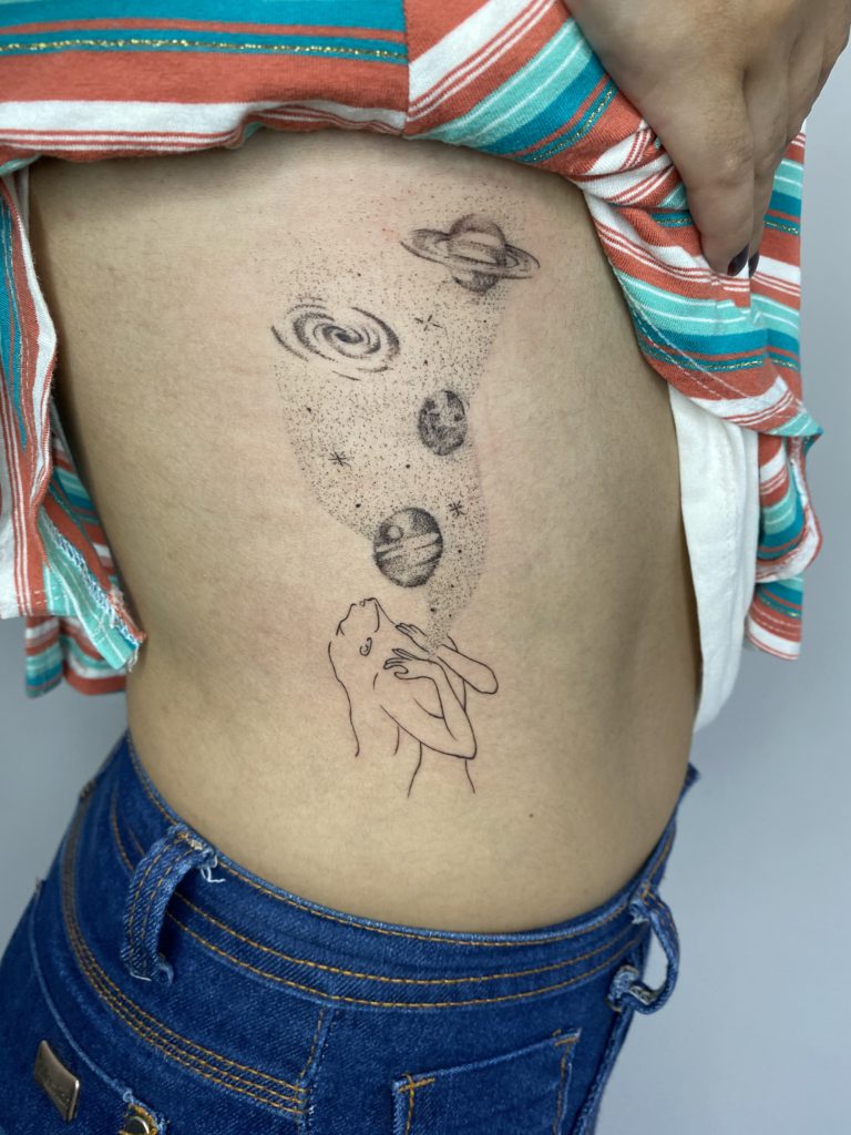 “Não sei dizer exatamente quando me tornei artista. Desde que me entendo por gente o desenho sempre fez parte da minha vida. E quando não, sempre dava um jeitinho para poder desenhar. Sempre fui muito de fazer planos e assim que fiz 18 anos juntei todo dinheirinho que tinha guardado, comprei meu primeiro kit de tattoo e nunca mais parei. Hoje em dia, 4 anos depois, trabalho com foco em traços finos e me inspiro muito no fineline coreano, pela delicadeza e harmonia.”