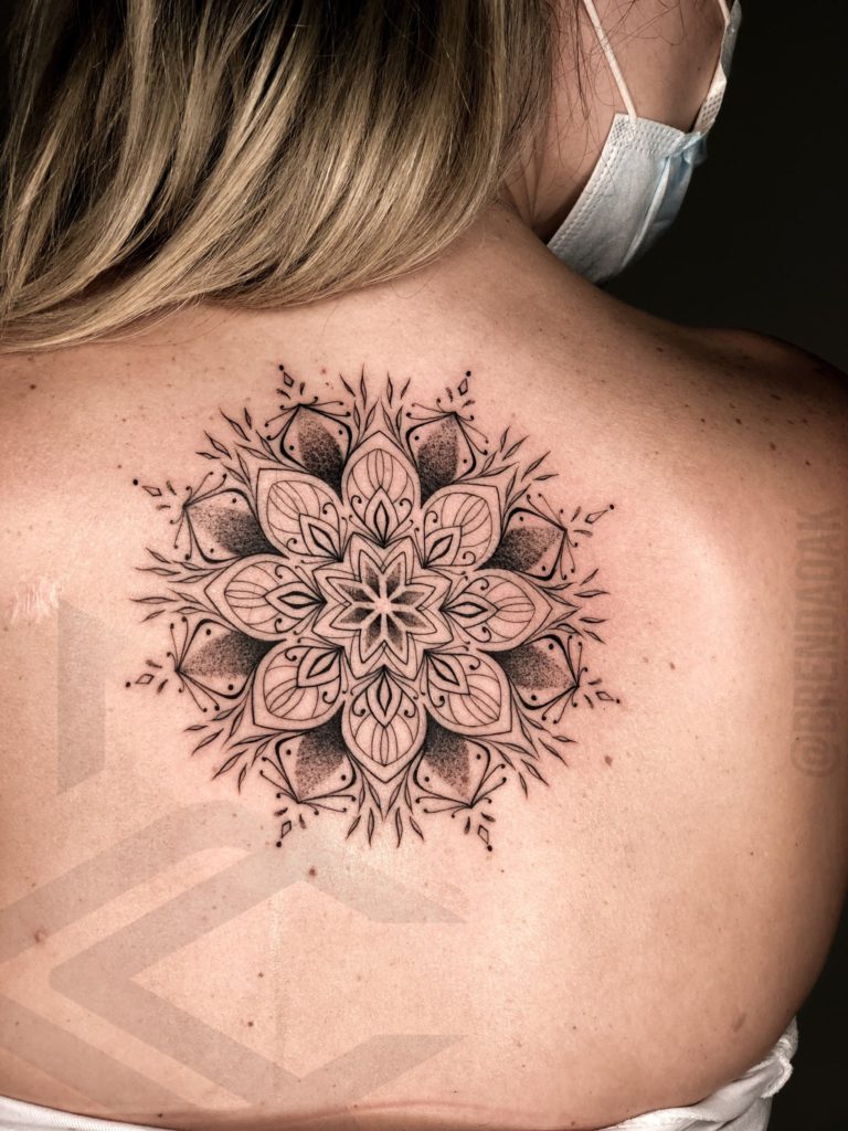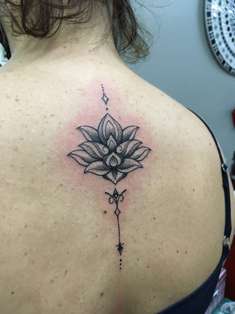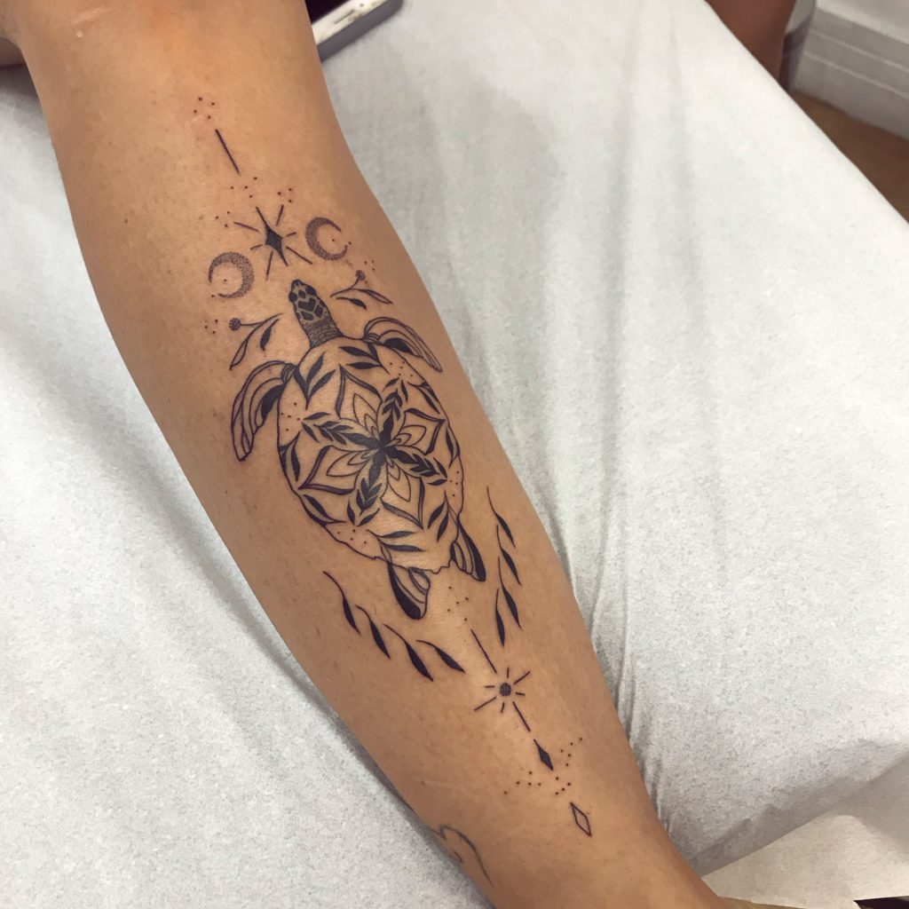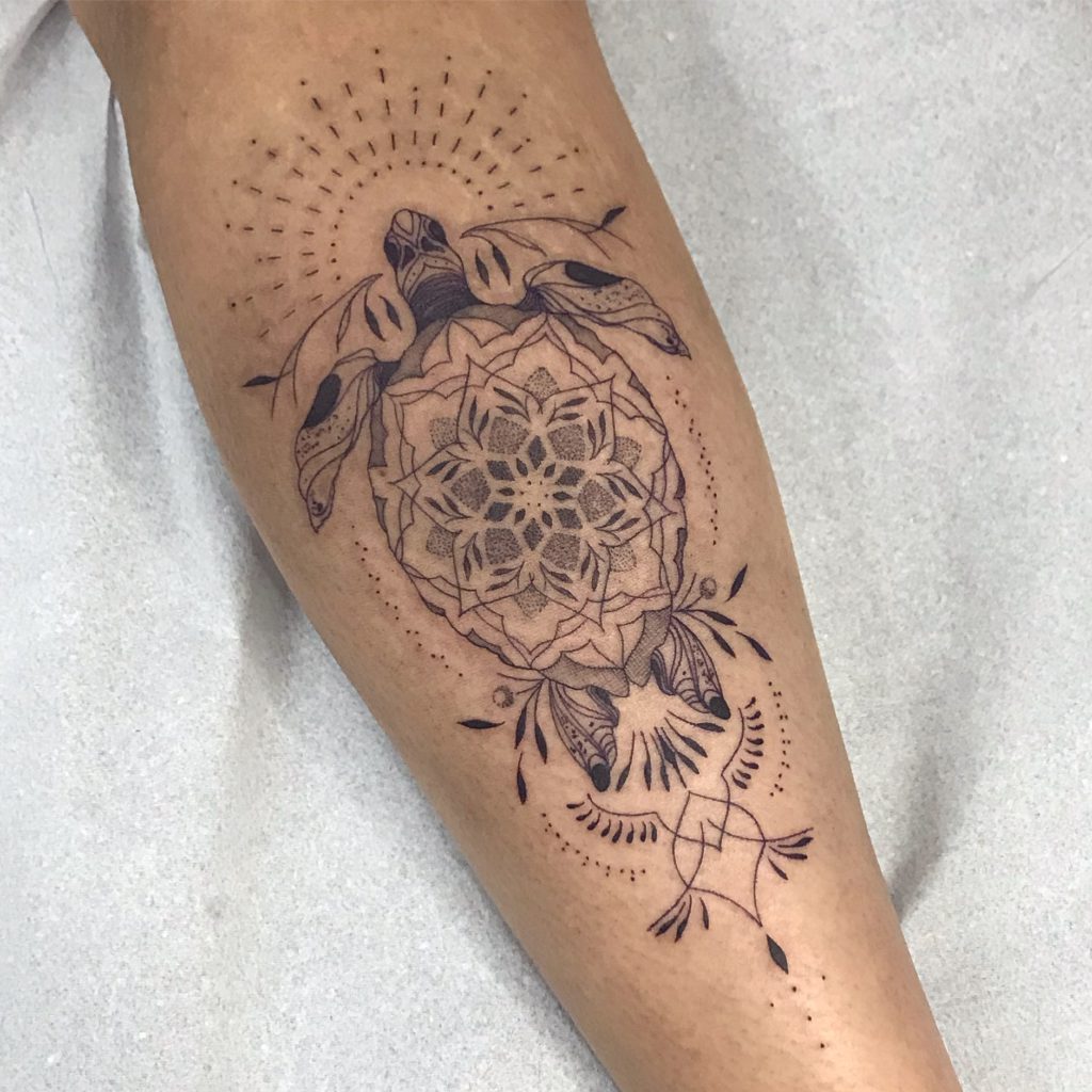 “Desde pequena gosto de desenho, mas foi na gravidez que parei a correria da vida e me envolvi com a arte. Há quase 2 anos, morei numa cidade bem pequena, onde não existia tatuador, e comecei a aprender pelo YouTube! Foi difícil, mas tive apoio de uma família incrível nessa fase inicial. Depois, me mudei para Uberlândia e tive apoio de um tatuador maravilhoso, que me ensinou bastante, antes de eu chegar no Estúdio que estou hoje. Gosto de fineline, e tem a mistura com o blackwork. Sou apaixonada por geométricos e mandalas. Mas o que faz meu coração bater mais forte, é a sensação de poder materializar em pele, expressar em cada pele, o que a alma carrega. Esse é meu alimento! Tenho como inspiração as #minadogaveta que trabalham comigo, alguns tatuadores da região, e com certeza o Rapha Lopes me inspira bastante!”