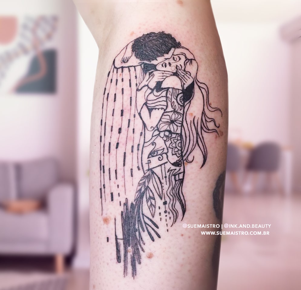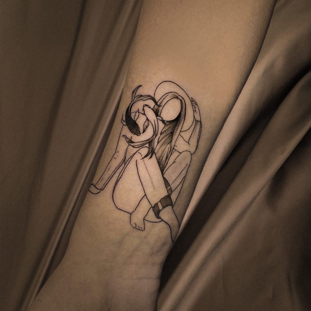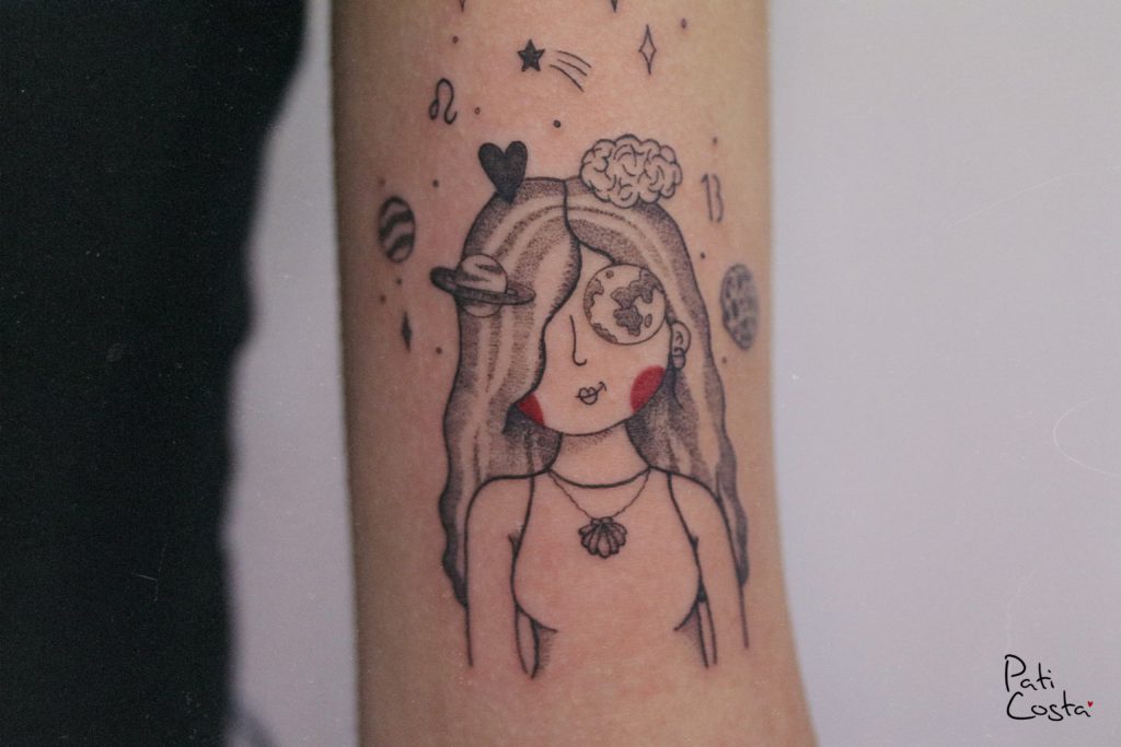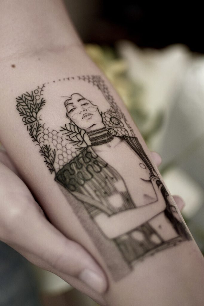 “Sou diretora de arte e ilustradora a mais de 15 anos, desenho desde sempre. No final de 2019 resolvi dar um novo propósito para minha arte e aprendi a técnica de tatuar para poder aplicar minhas artes autorais em pessoas que se conectassem com ela. Amo a tatuagem desde sempre e tatuar se tornou algo extremamente gratificante. Meu estilo é autoral, algo que carrego desde os trabalhos de publicidade, então acabo transitando bastante no fineline com estilo próprio. Eu busco inspiração em várias fontes: em artistas que admiro como Klimt, Mucha, na natureza, no cinema, nas pessoas e na vida. Eu tatuo emoções.”