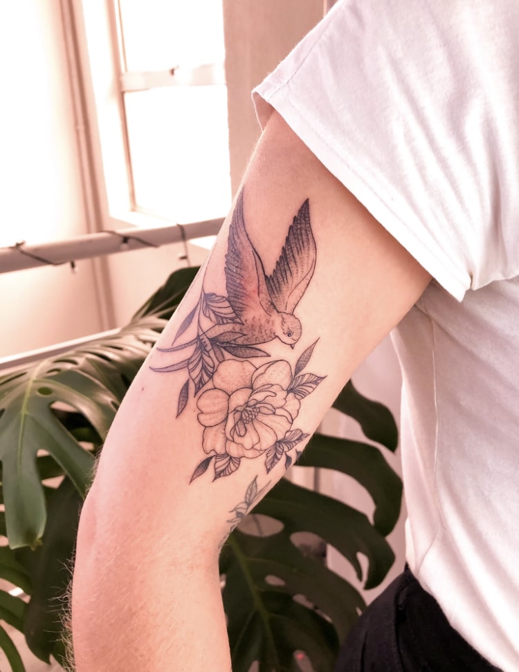 “A minha entrada na tatuagem veio através do design gráfico e publicidade, mas sempre tive paixão por desenho e a tatuagem foi a forma de migrar e conseguir conciliar um pouco das duas coisas que eu gostava. Após 6 anos de trabalho passando por vários estilos, venho focando no fineline direcionado a florais, animais usando a própria natureza como inspiração.”