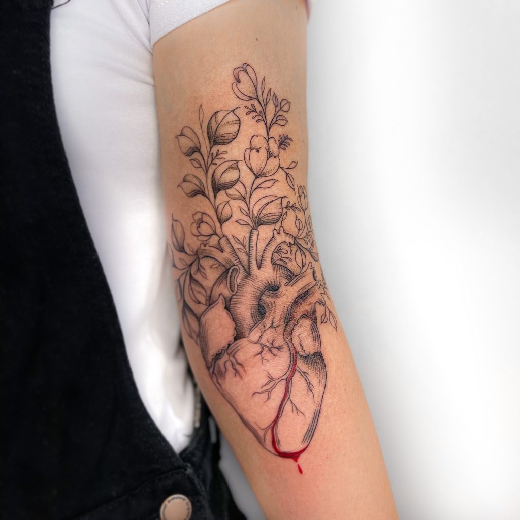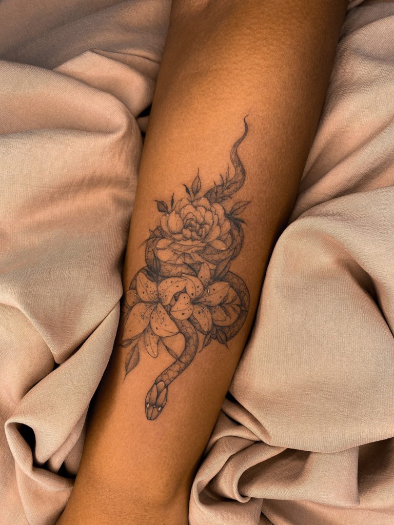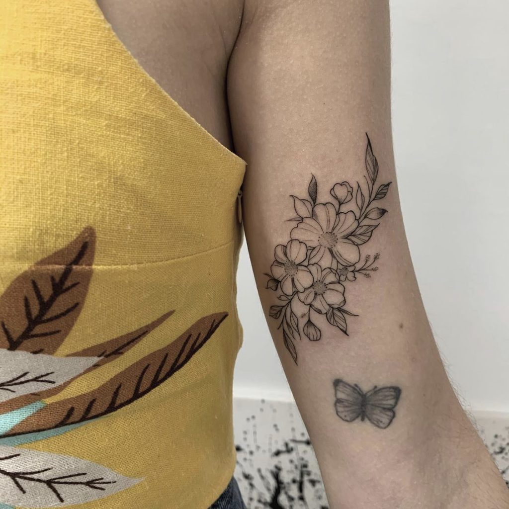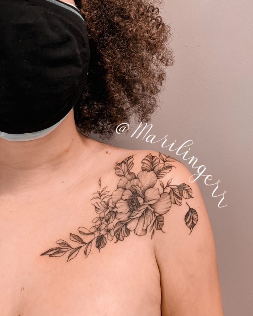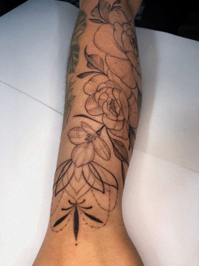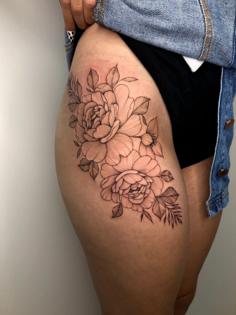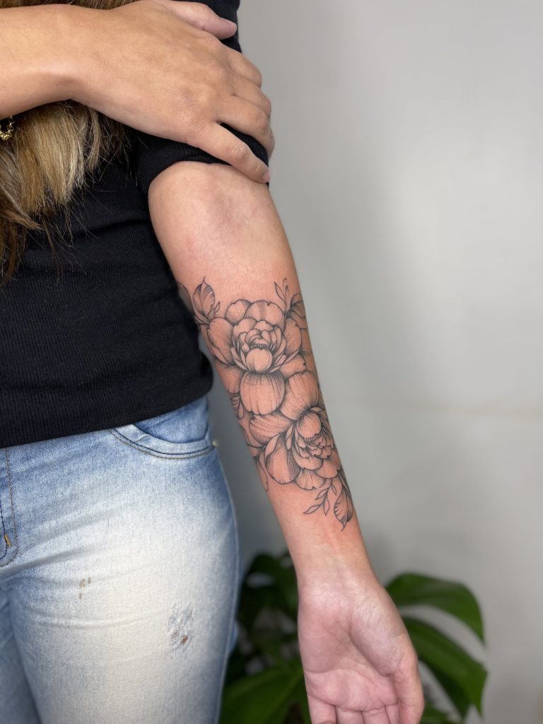 “Tatuo há 3 anos e meio, trabalho com blackwork, fineline e uma mistura de alguns vários estilos. Eu amo os contrastes. Meu trabalho é inspirado principalmente no feminino, nas flores, em corpos reais, no afeto, nas histórias das minhas clientes trazendo sempre a individualidade delas.”