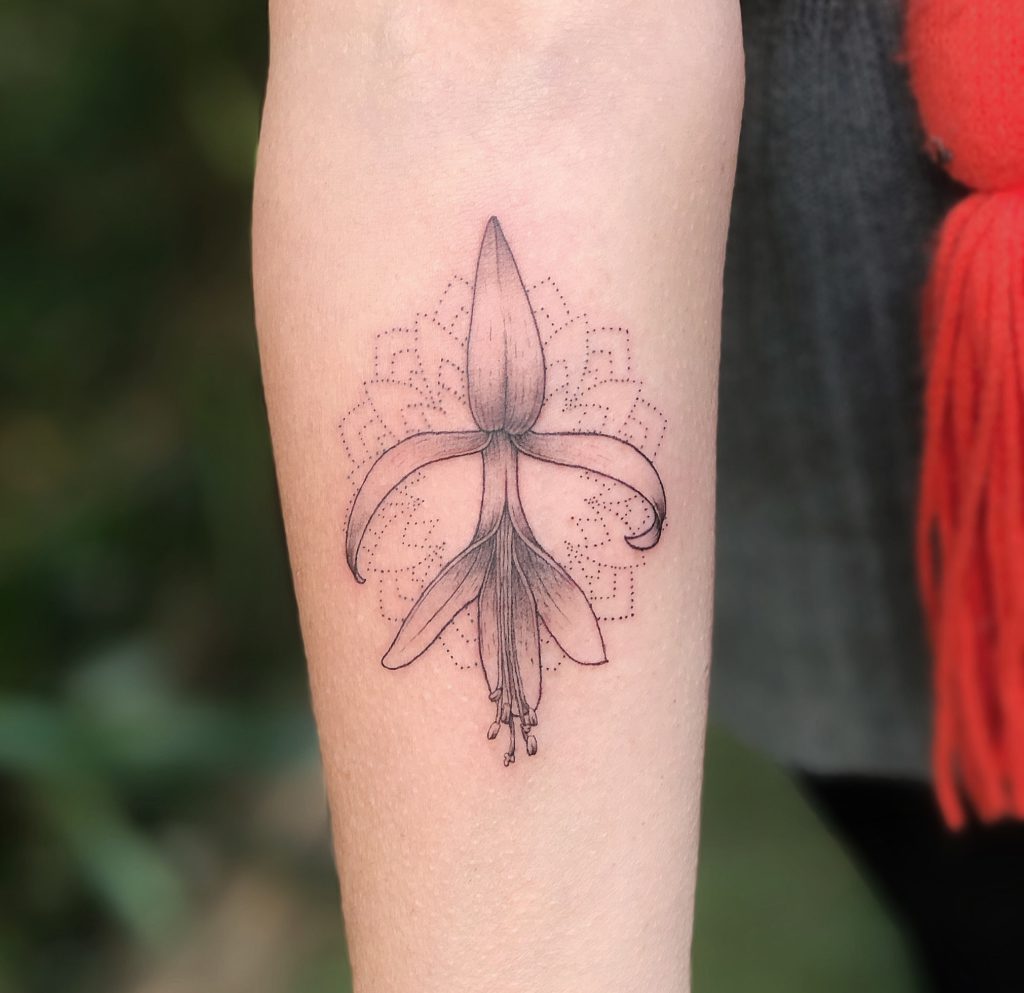 “Meu contato com a arte é desde que me entendo por gente. Meu pai é músico e compositor e sempre fui fascinada pela beleza da natureza. Há 4 anos comecei a tatuar no estúdio do meu companheiro e hoje sou muito feliz e realizada com minha jornada e profissão. Trabalho com fineline e me inspiro principalmente em trabalhos delicados.”