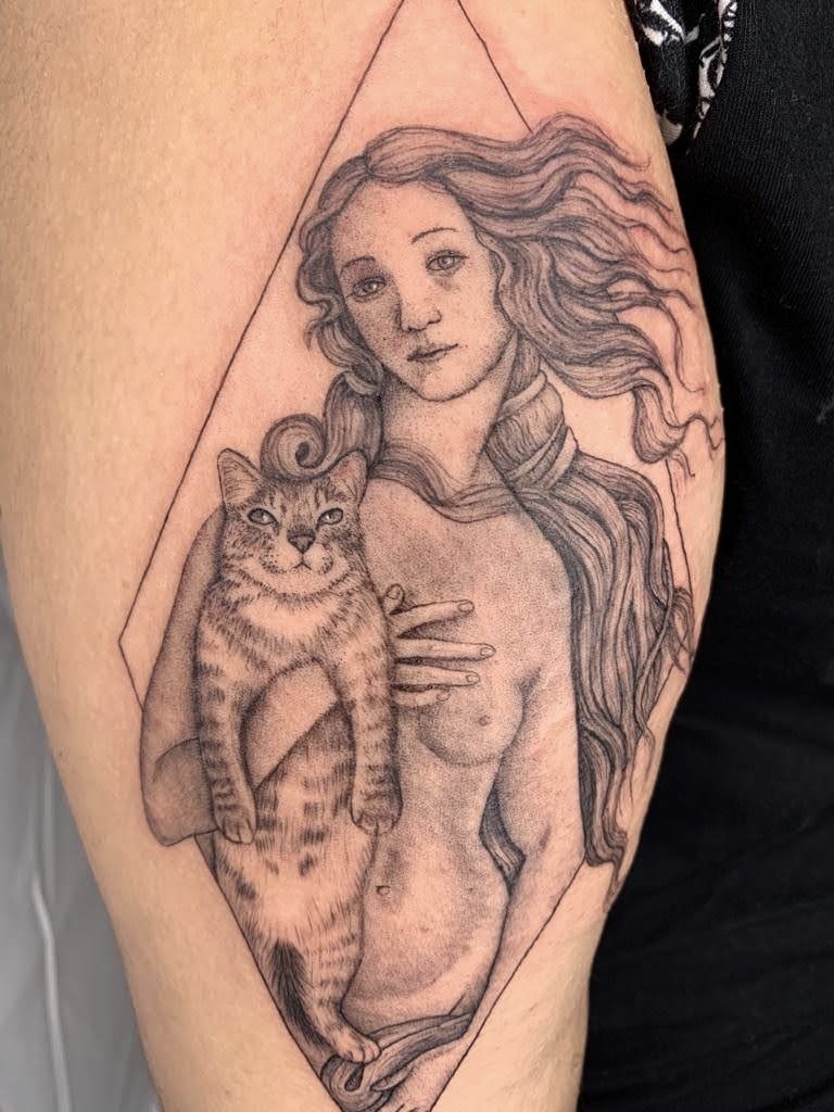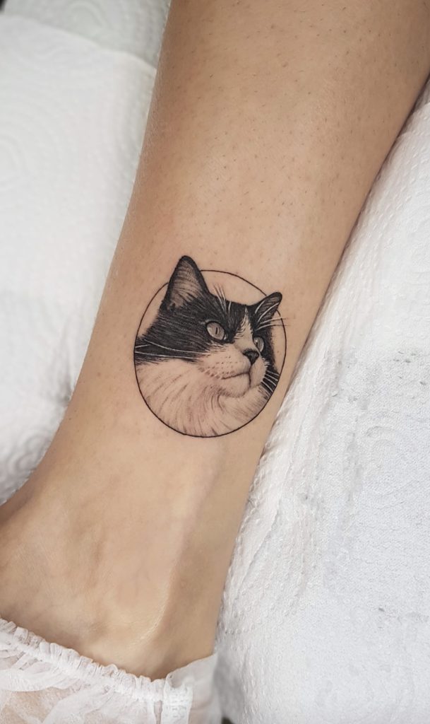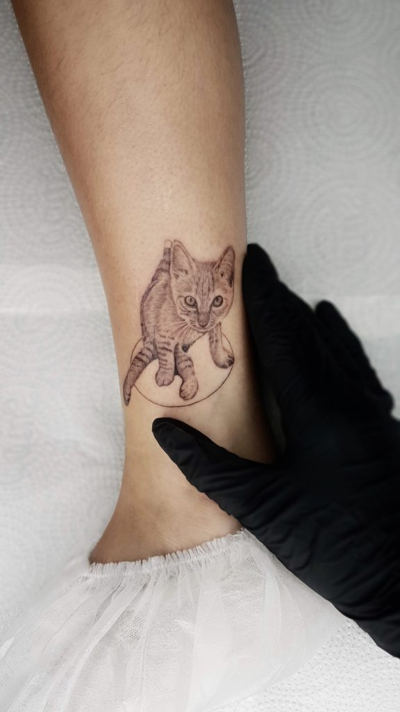 “Tiveram dois momentos muito especiais que merecem ser falados: a minha primeira tatuagem pet, que foi uma reviravolta profissional. Foi uma vez que fiz um guest em Porto Alegre, eu era super insegura, tinha 1 ano de tattoo, e a recepcionista do estúdio que virou uma grande amiga, se ofereceu para eu praticar nela o que eu mais tinha vontade de tatuar, então ela pegou fotos dos seus 4 gatinhos, e eu fiz, sem nem saber o que estava fazendo direito.