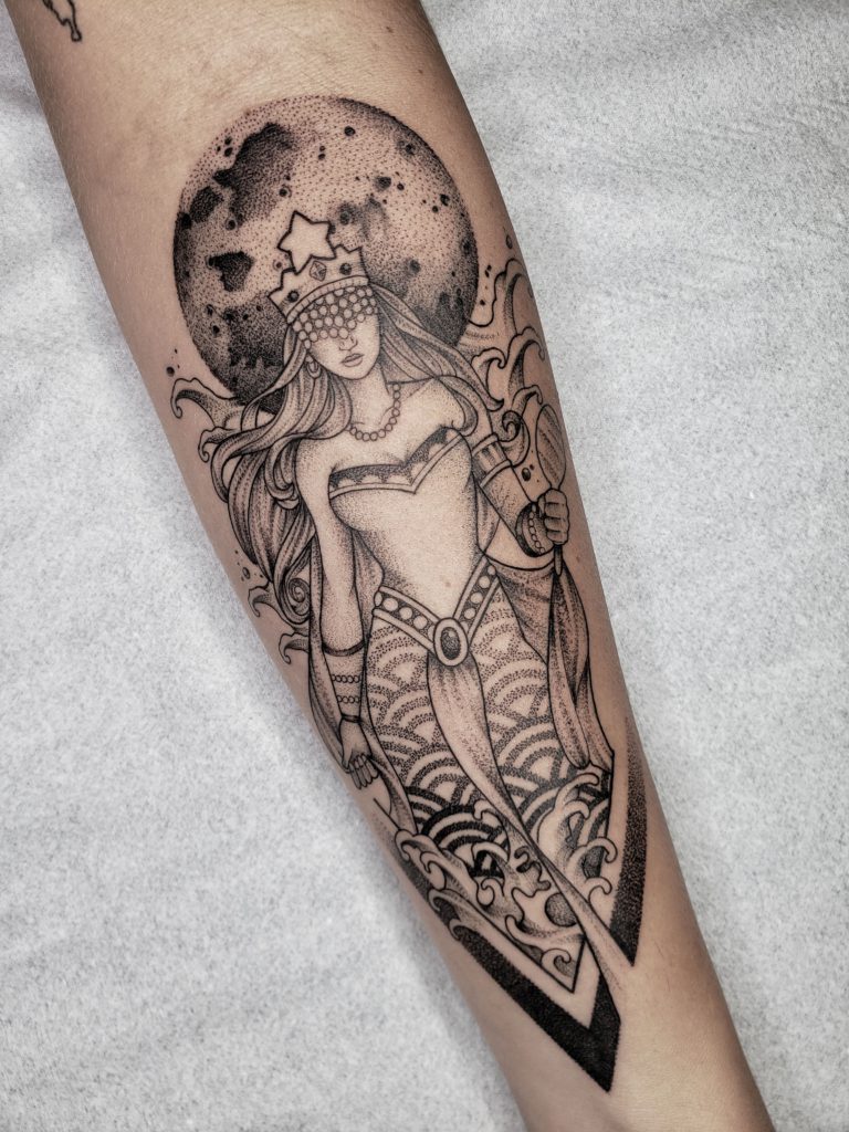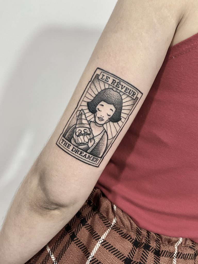 “Eu morei 10 anos na cidade das artes, Barcelona. Lá eu trabalhei com cenografia, tendo muito contato com artistas de diversas áreas. Lá também conheci o trabalho de pontilhismo nas tatuagens. Voltei pra minha cidade em 2011, comecei a tatuar em 2012 e desde então nunca mais parei.”
