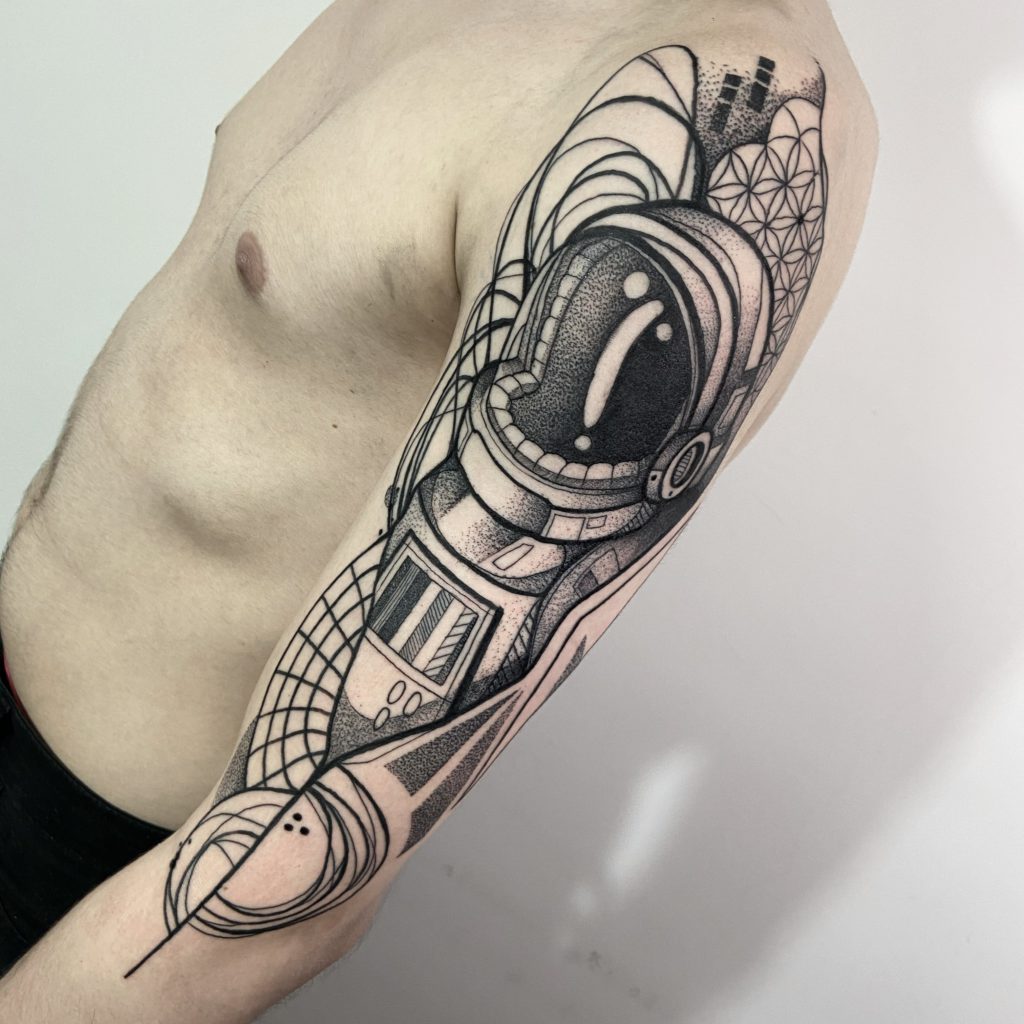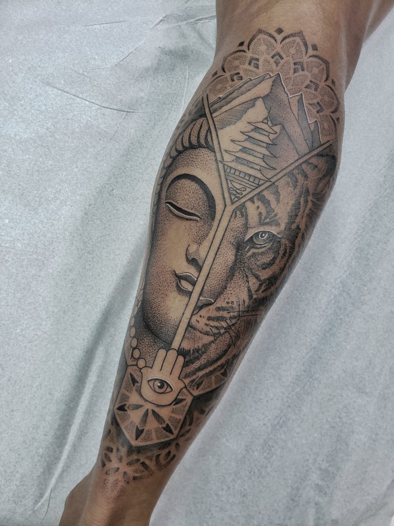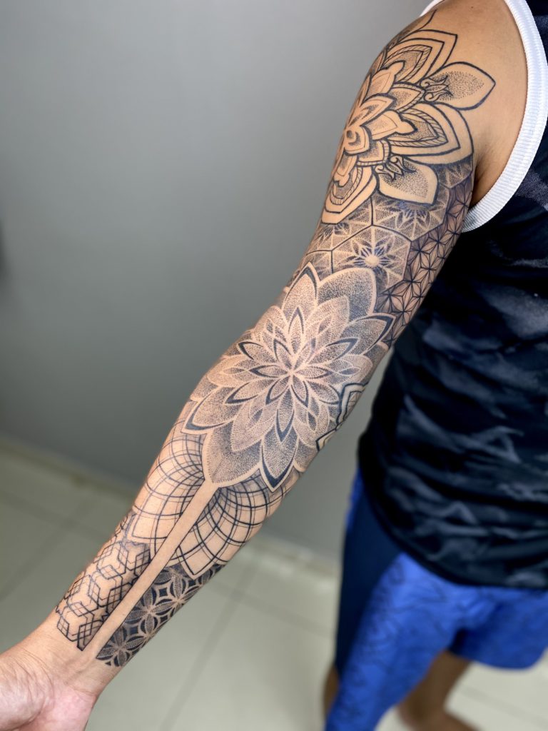 “Tudo começou quando eu desenhava realismo no papel e também gostava de fazer alguns ornamentais de caneta na minha mão, até que um dono de um estúdio famoso na minha cidade natal (volta redonda) viu meus desenhos em rede social e resolveu me chamar para aprender a tatuar, abracei a oportunidade e hoje eu tenho meu próprio estúdio em Volta Redonda e atendo também no Rio de Janeiro (Tijuca). Ao longo dos anos fui aprimorando minhas técnicas e me identificando com os estilos que eu já desenhava no papel e na pele (de caneta) lá do início, realismo, geométrica, pontilhismo e ornamentais. Hoje eu faço uma espécie de artfusion, criando artes únicas para meus clientes juntando os estilos que mais gosto de fazer, uma mistura de realismo com geometria, criando até uma identidade nos meus trabalhos.”