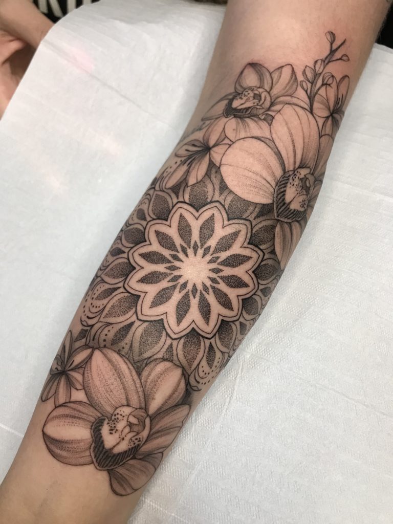 “Me tornei tatuadora através de uma brincadeira, pois depois de muito acompanhar o artista Wilton Reis, certo dia, um amigo fazia uma visita no estúdio, e falou “Ciane faz uma tatuagem em mim?” Eu até sorri na hora e falei “sério?” Kkkkk agora… Como a primeira tatuagem que fiz ficou boa, daí então não parei mais. Venho me dedicando cada dia mais no estilo pontilhismo, geométrico e florais, esses são os estilos que mais amo fazer.”