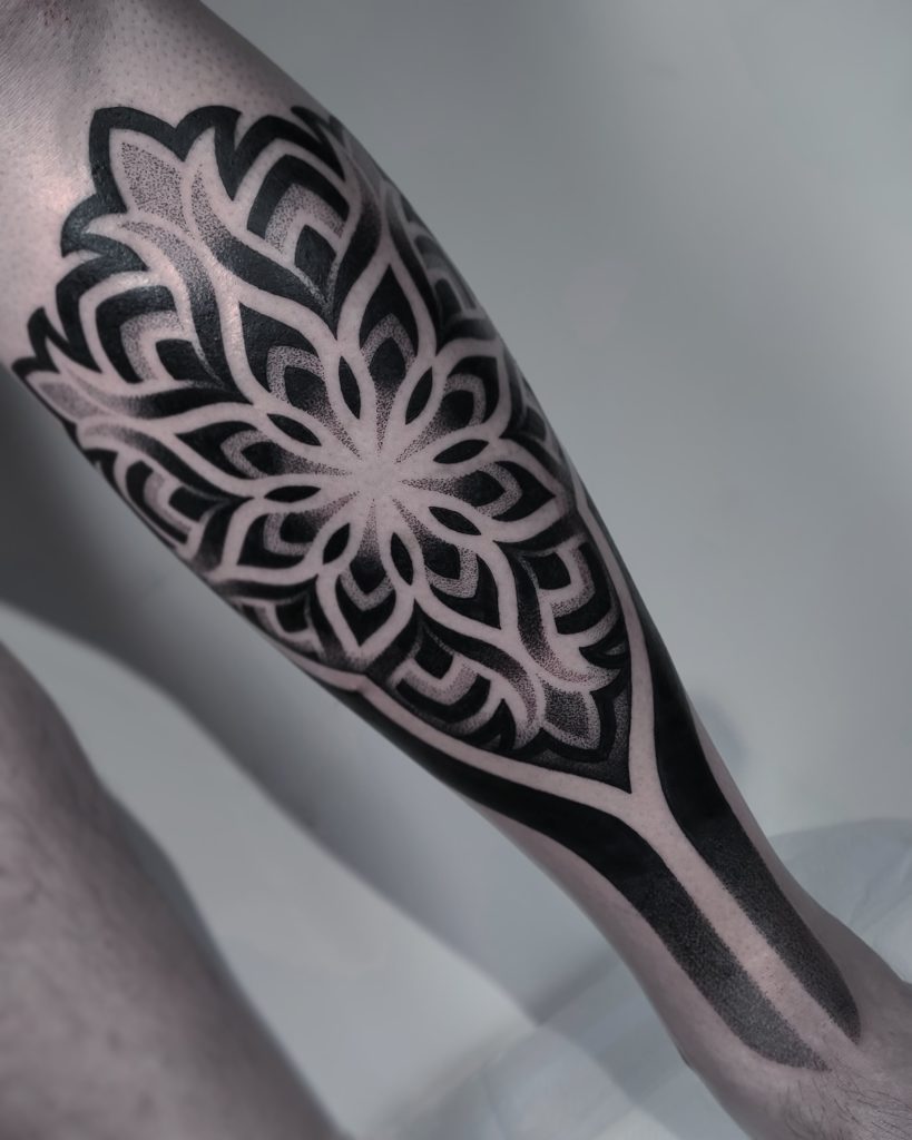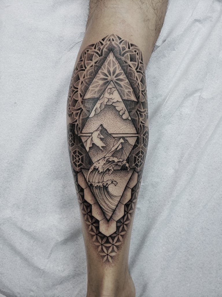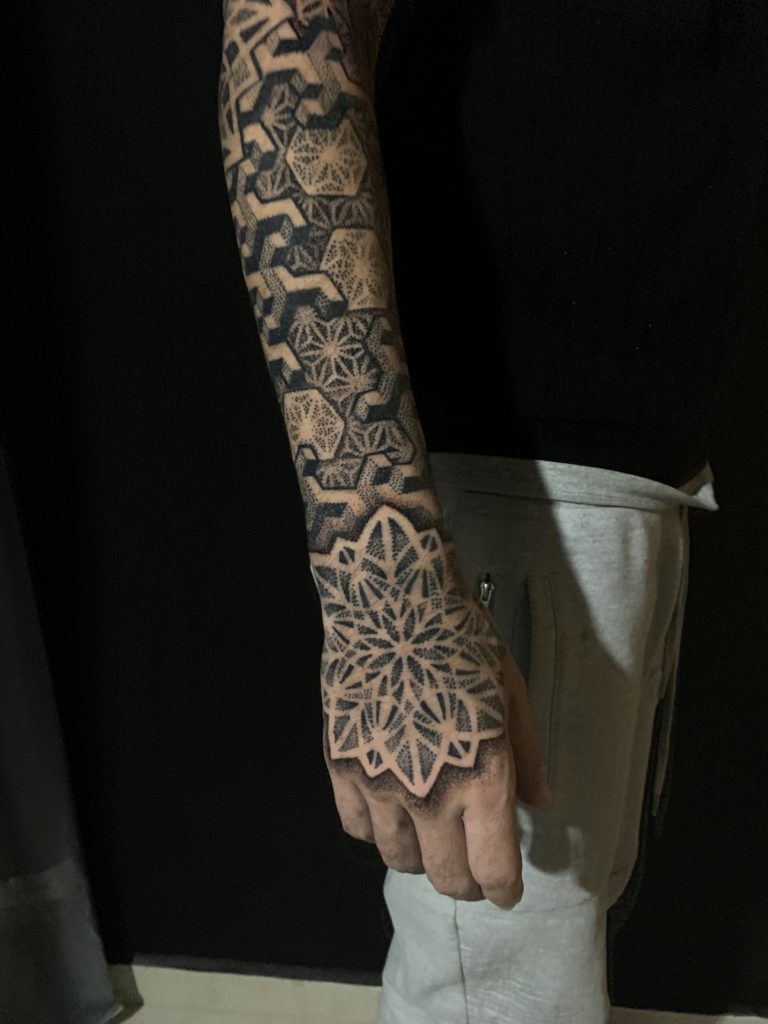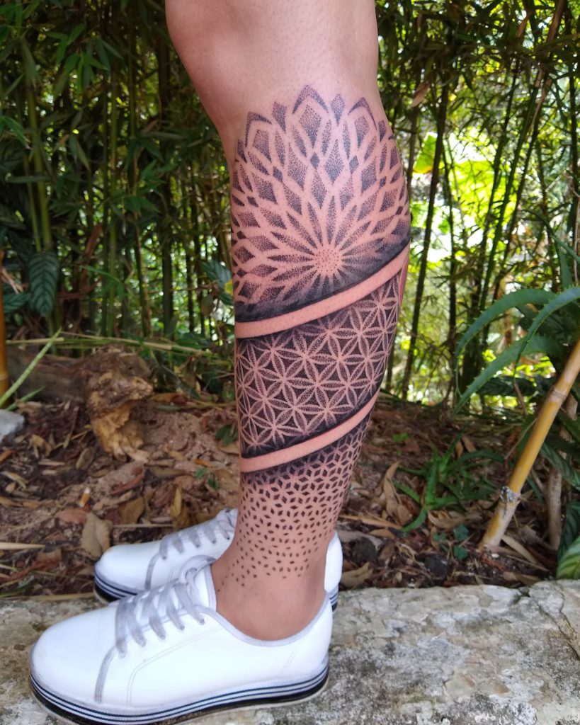 “Sempre gostei de desenhar, desde bem novo. Mas o gosto pela tatuagem veio com o tempo, primeiro como consumidor. Nesse tempo eu já pesquisava diversos artistas e sempre buscava novas referências. Nessa época eu já olhava estes trabalhos e imaginava outras alternativas, o que poderia ser feito diferente, por exemplo. Tatuo há quatro anos, com blackwork e pontilhismo, com destaque para geometria sagrada em pontilhismo. Minhas maiores inspirações são o que estão ao meu redor. Tento buscar referências de outras áreas, momentos, ambientes. São momentos específicos de inspiração instantânea.”