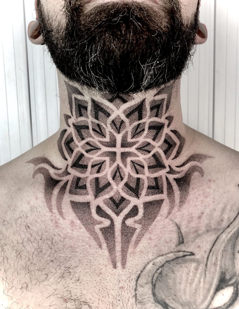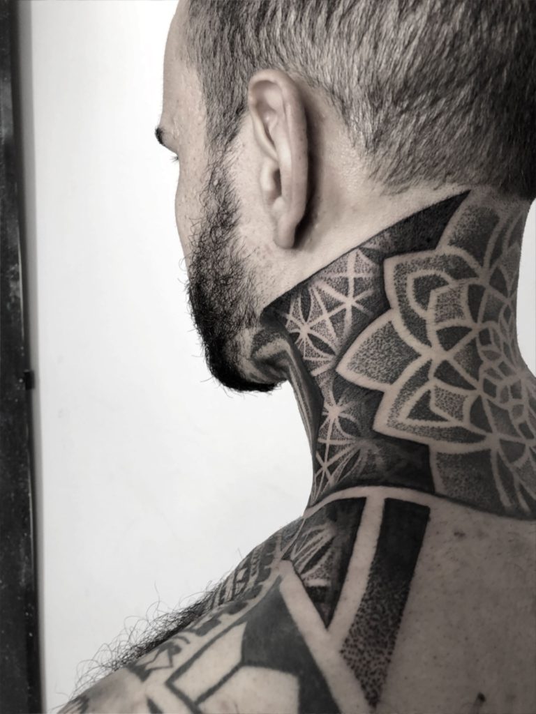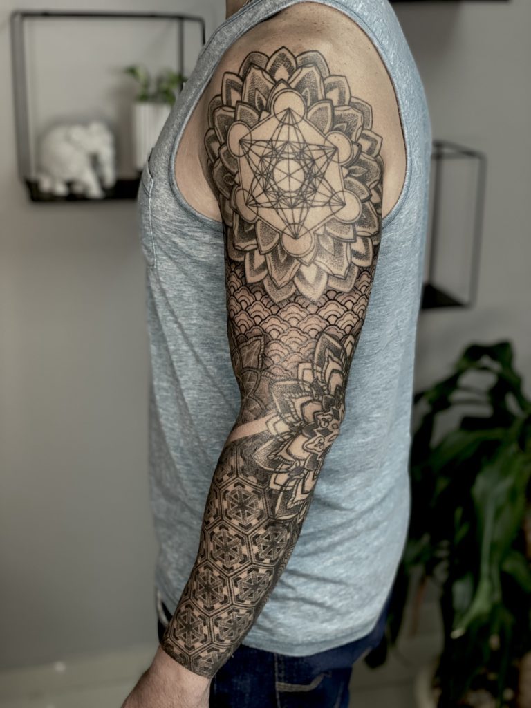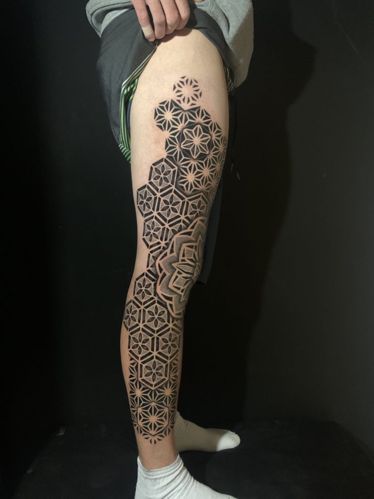 “Sempre gostei de desenhar, desde bem novo. Mas o gosto pela tatuagem veio com o tempo, primeiro como consumidor. Nesse tempo eu já pesquisava diversos artistas e sempre buscava novas referências. Nessa época eu já olhava estes trabalhos e imaginava outras alternativas, o que poderia ser feito diferente, por exemplo. Tatuo há quatro anos, com blackwork e pontilhismo, com destaque para geometria sagrada em pontilhismo. Minhas maiores inspirações são o que estão ao meu redor. Tento buscar referências de outras áreas, momentos, ambientes. São momentos específicos de inspiração instantânea.”
