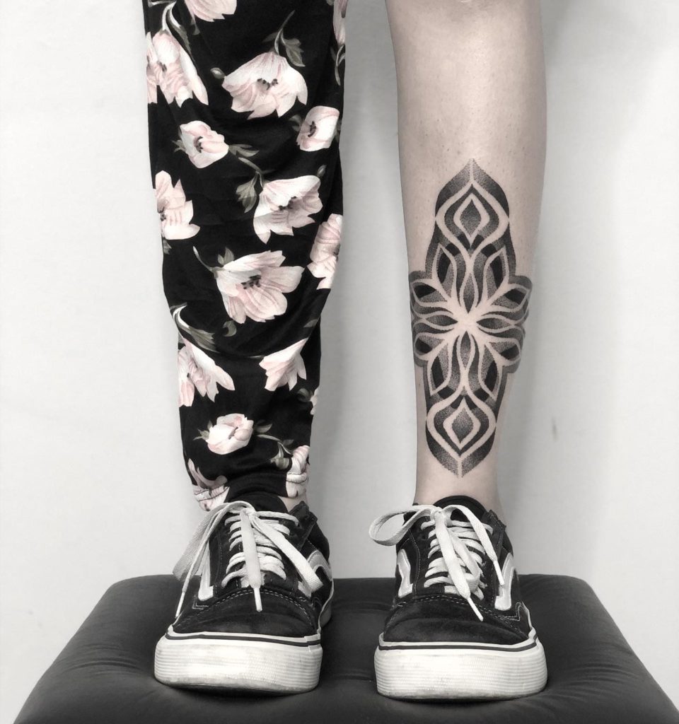 “Tatuo há cerca de 5 anos. As maiores inspirações para meus trabalhos são a natureza, formas da geometria sagrada e obras do artista M. C. Escher. Gosto de usar o contraste entre traços grossos e finos com a delicadeza do pontilhismo para desenvolver uma arte exclusiva e moderna.”
