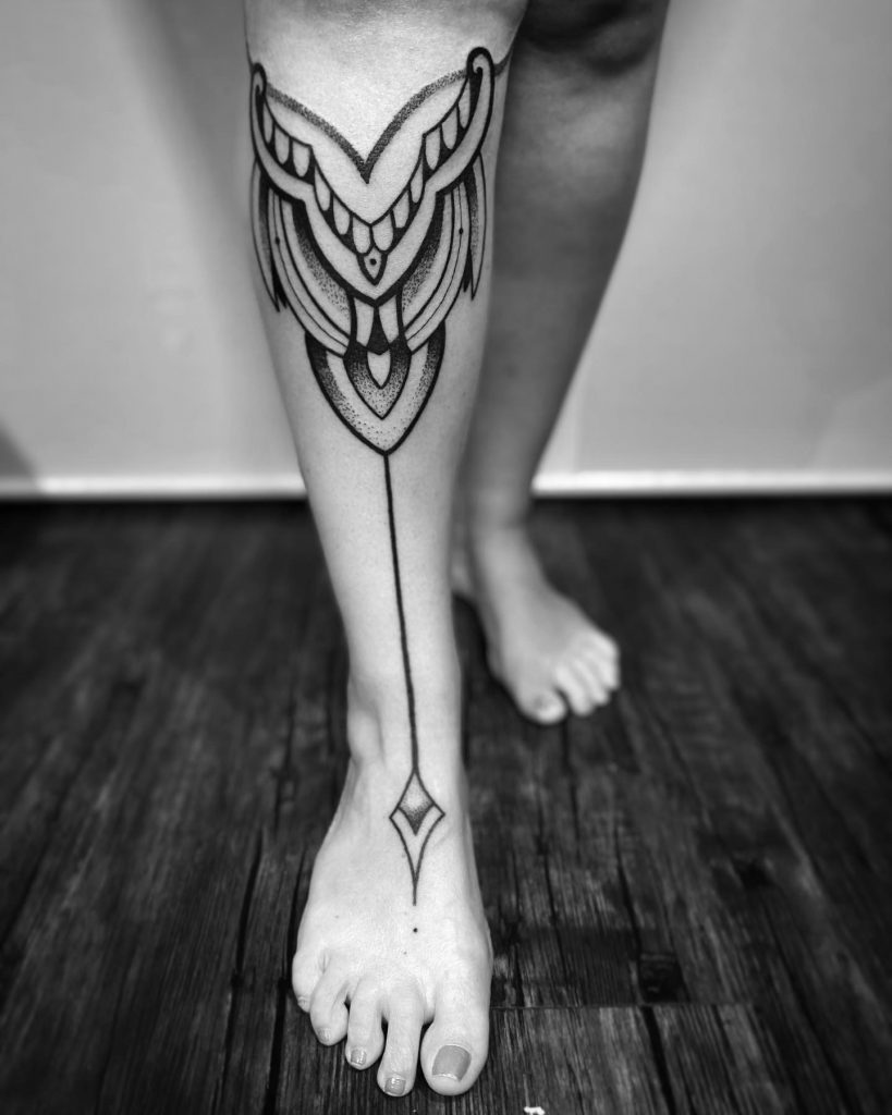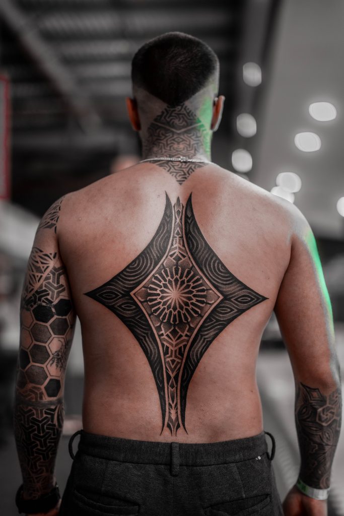 As tatuagens geométricas são uma celebração da precisão e da simetria. Utilizando formas como triângulos, círculos e linhas retas, esses designs criam padrões complexos e visualmente impressionantes. A tinta preta destaca as formas e dá uma sensação de ordem e equilíbrio. As tatuagens geométricas podem ser simples e minimalistas ou intricadas e detalhadas, dependendo da visão do artista e do cliente.