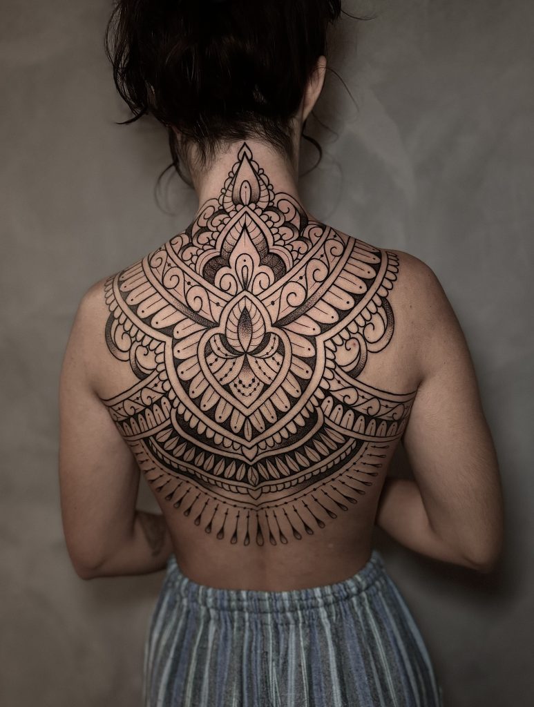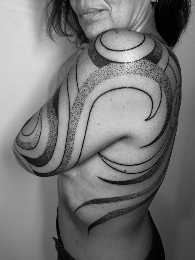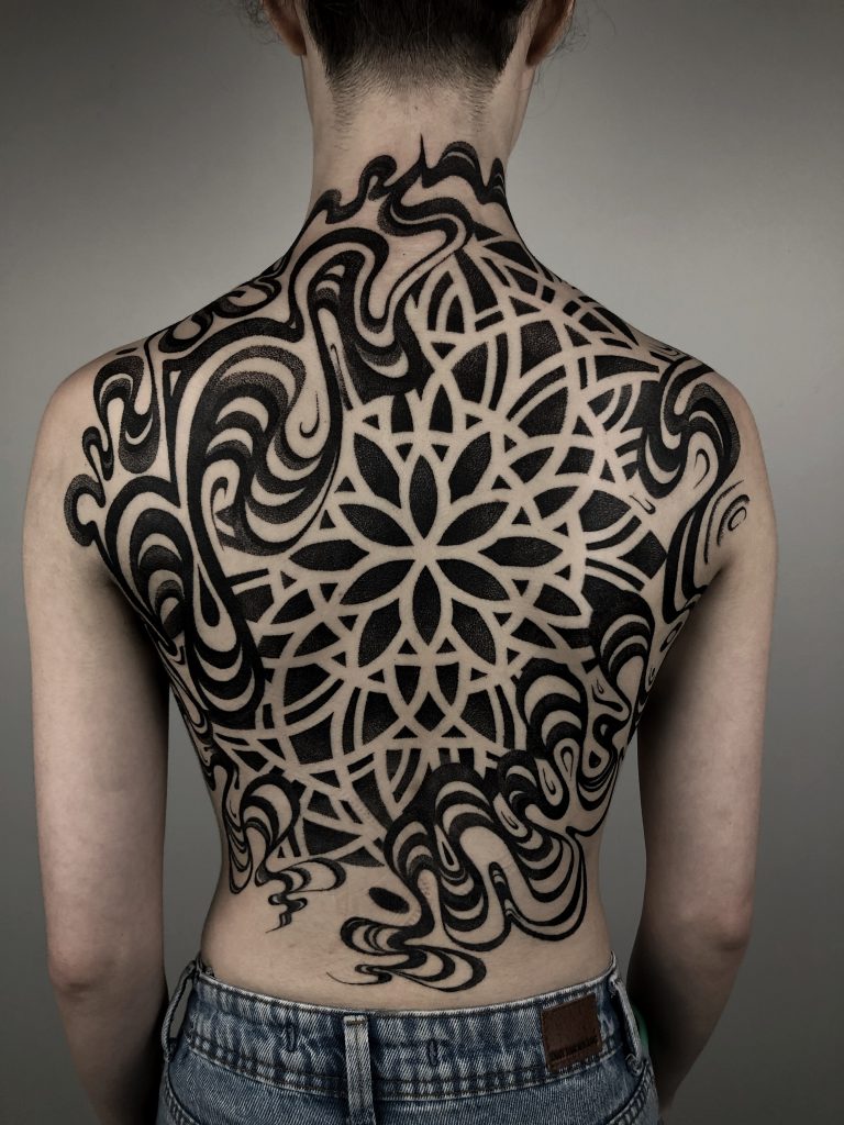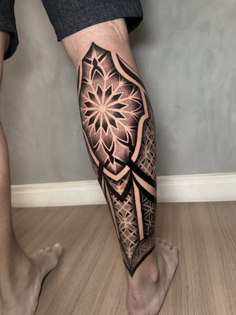 O estilo Blackwork é conhecido por seu uso audacioso de tinta preta sólida. Com linhas grossas e áreas preenchidas de preto intenso, esse estilo cria designs impressionantes que capturam a atenção à primeira vista. Blackwork é ideal para padrões geométricos, mandalas, e até mesmo formas abstratas. O contraste entre a tinta preta e a pele nua dá um efeito visual poderoso e hipnotizante.