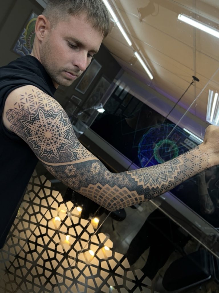 Bob é especialista em Pontilhismo e Geométrico, criando artes autorais que valorizam a anatomia de cada cliente. Cada tatuagem é única, respeitando a individualidade de quem a carrega. Bob trabalha com mandalas, padrões geométricos, flores, fractais e geometria sagrada, sempre com um toque pessoal que transforma cada peça em uma obra de arte exclusiva.