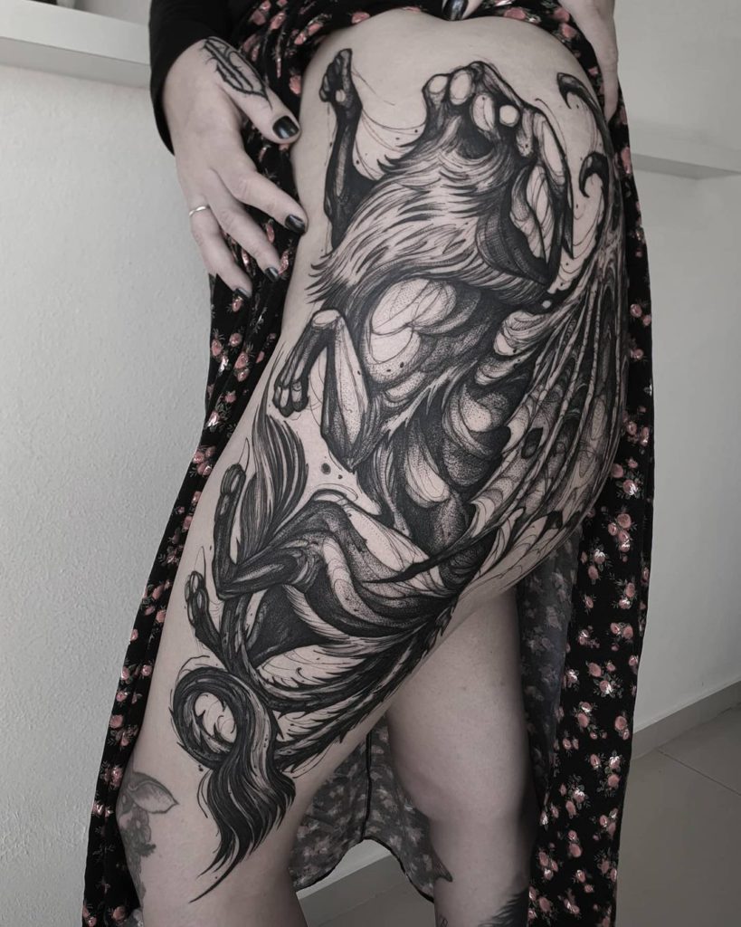 “Sempre fui ligada a arte de alguma forma e em 2013 entrei para faculdade de Belas Artes, que me proporcionou um contato mais complexo e intenso. Comecei a tatuar em 2017, e de lá para cá foram muitos processos. Gosto de trazer um pouco de desconstrução para a tatuagem, interferir naquilo que poderia ser visualmente fiel ao real, misturando um pouco de surrealismo, trazendo alguma textura, pincelada, traços mais soltos ou composição que estamos acostumados a usar em outros suportes como, papel e tela. Tento sempre trazer referências da arte contemporânea, surrealista e abstrata.”