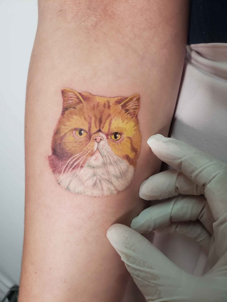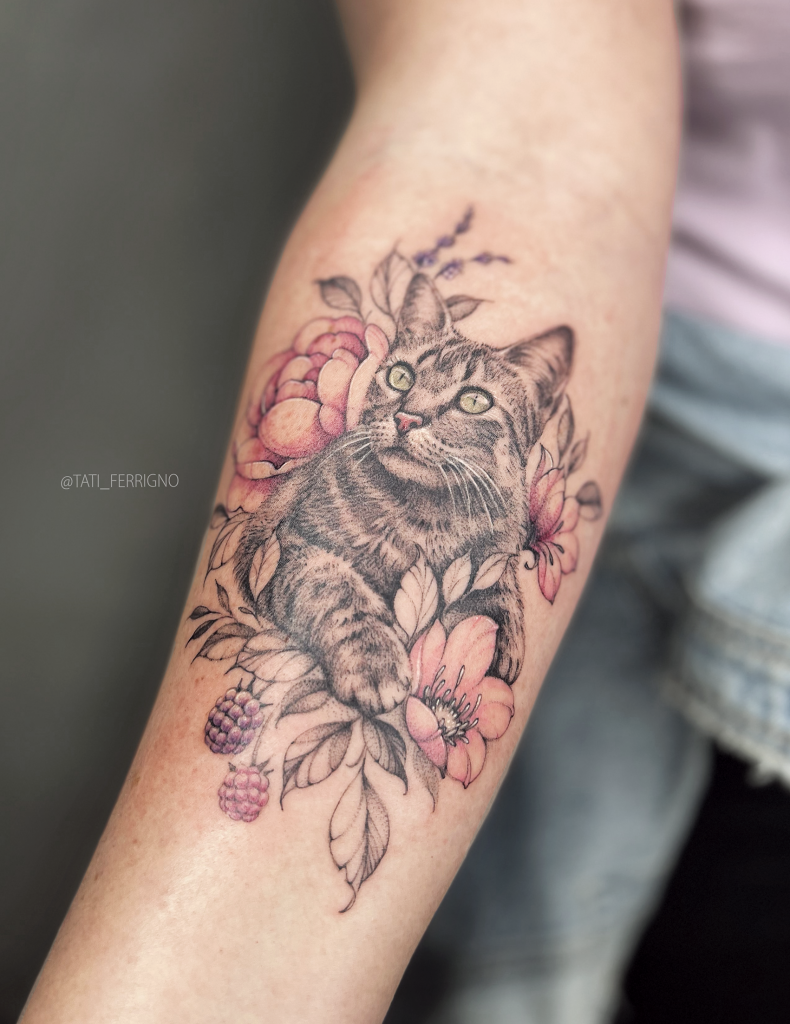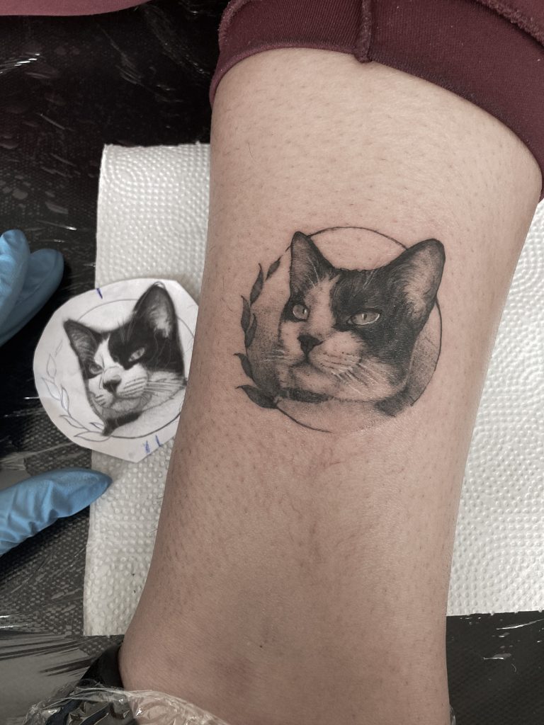 “Meu nome é Natália, sou bióloga, comecei a tatuar em 2018, e hoje me identifico muito com os estilos realistas, contemporâneos e abstratos. Sou apaixonada por animais e não seria diferente com cães e gatos! Meu carinho é transferido em cada rostinho que eternizo!”