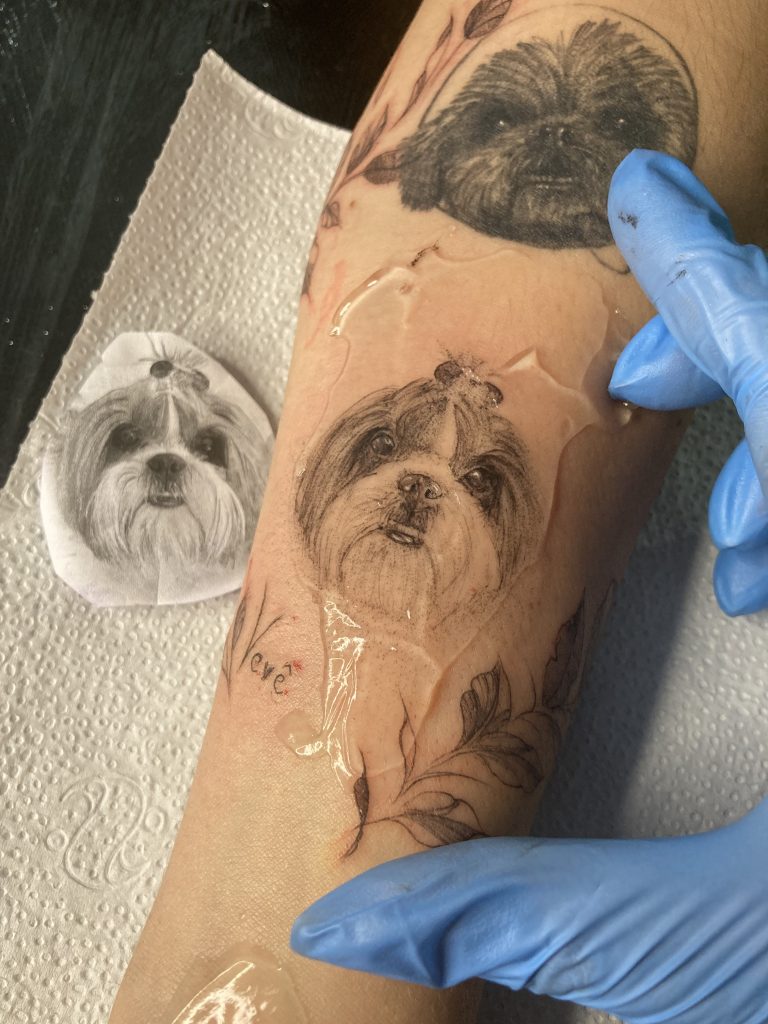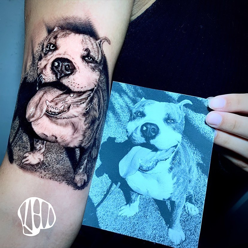 Melina tem 34 anos, é tatuadora há quase 15 anos. A artista trabalha com tattoos de realismo mas por gostar e expor bastante seu amor por cães acabou entrando em uma linha de tattoos Pet, onde cada um deles conta uma história única, que a artista faz com total amor, inclusive já tendo feito campanhas de doação de parte do valor arrecadado nas tattoos para ONGs que resgatam animais em sp.