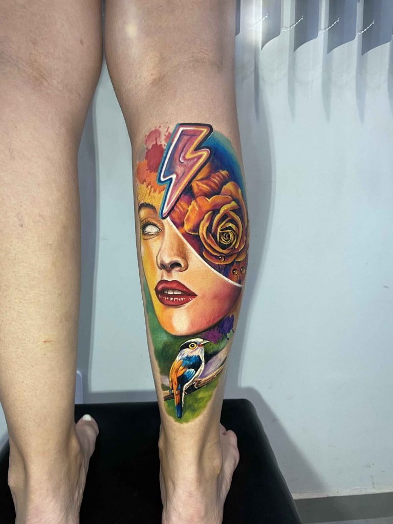“Eu sou o Fabricio Matos, já sou Tatuador há 16 anos e ao longo dessa caminhada gosto muito de tatuar com cores, desde então faço as tatuagens coloridas no realismo, full color, aquarela e mais alguns. No Brasil e no mundo temos vários artistas para se inspirar. E nisso venho estudando sempre para melhorar a técnica.”